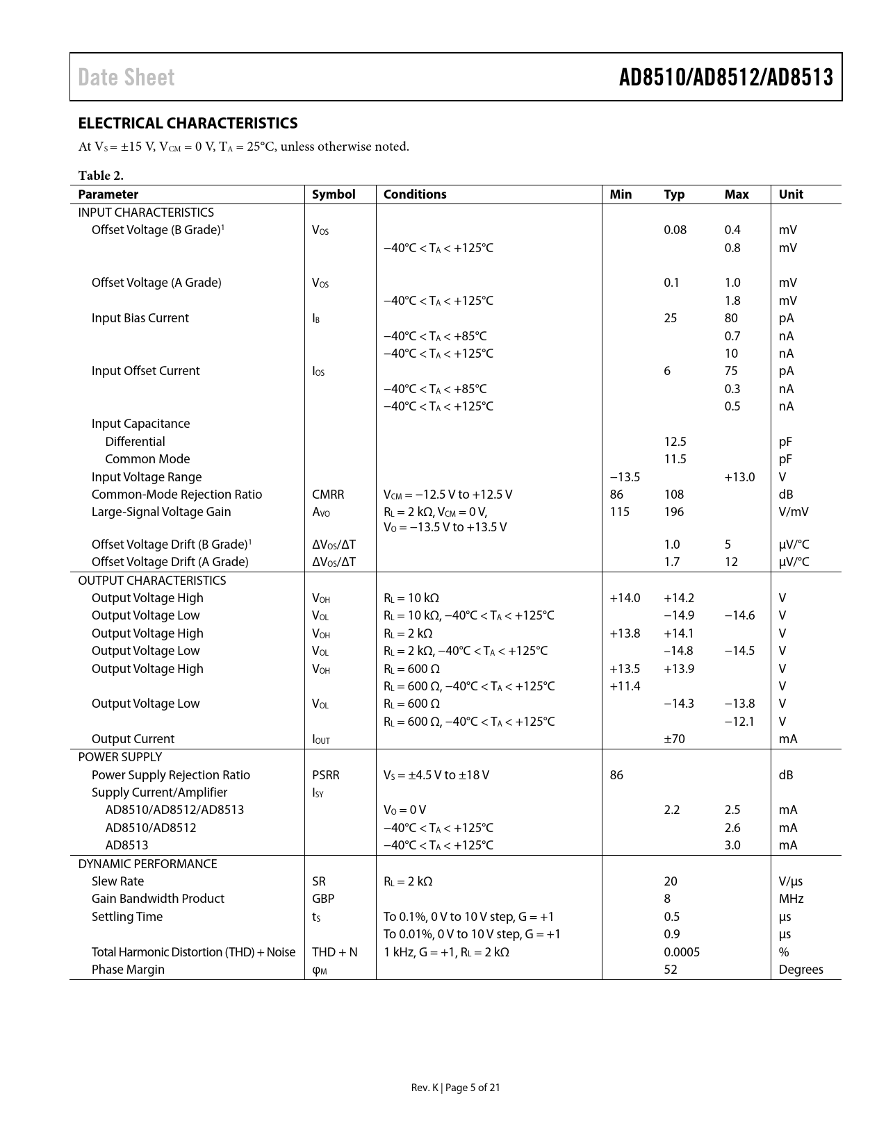 Pages / Page21 / 5 — Date Sheet. AD8510/AD8512/AD8513. ELECTRICAL CHARACTERISTICS. Table 2. …