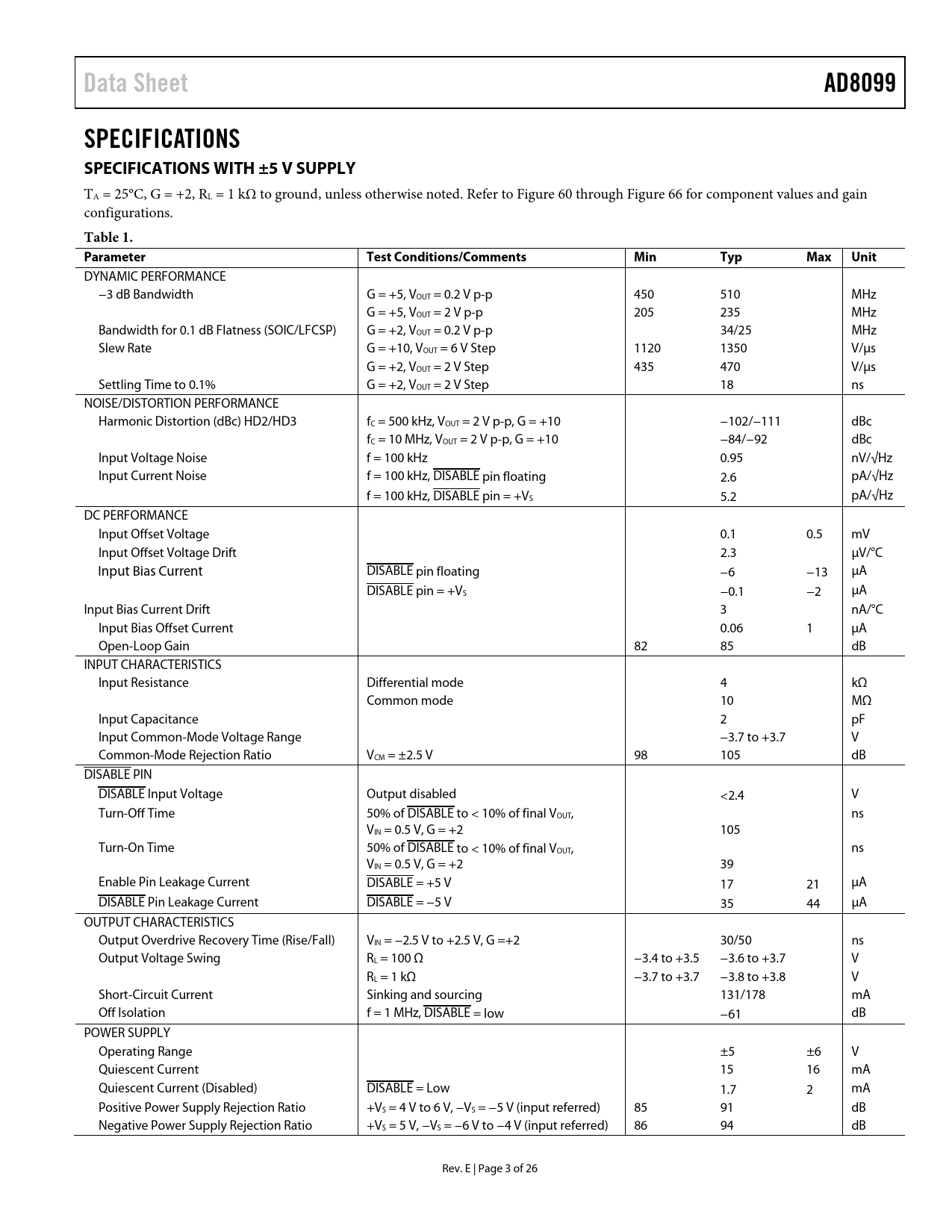 Pages / Page26 / 3 — Data Sheet. AD8099. SPECIFICATIONS SPECIFICATIONS WITH ±5 V SUPPLY. Table …