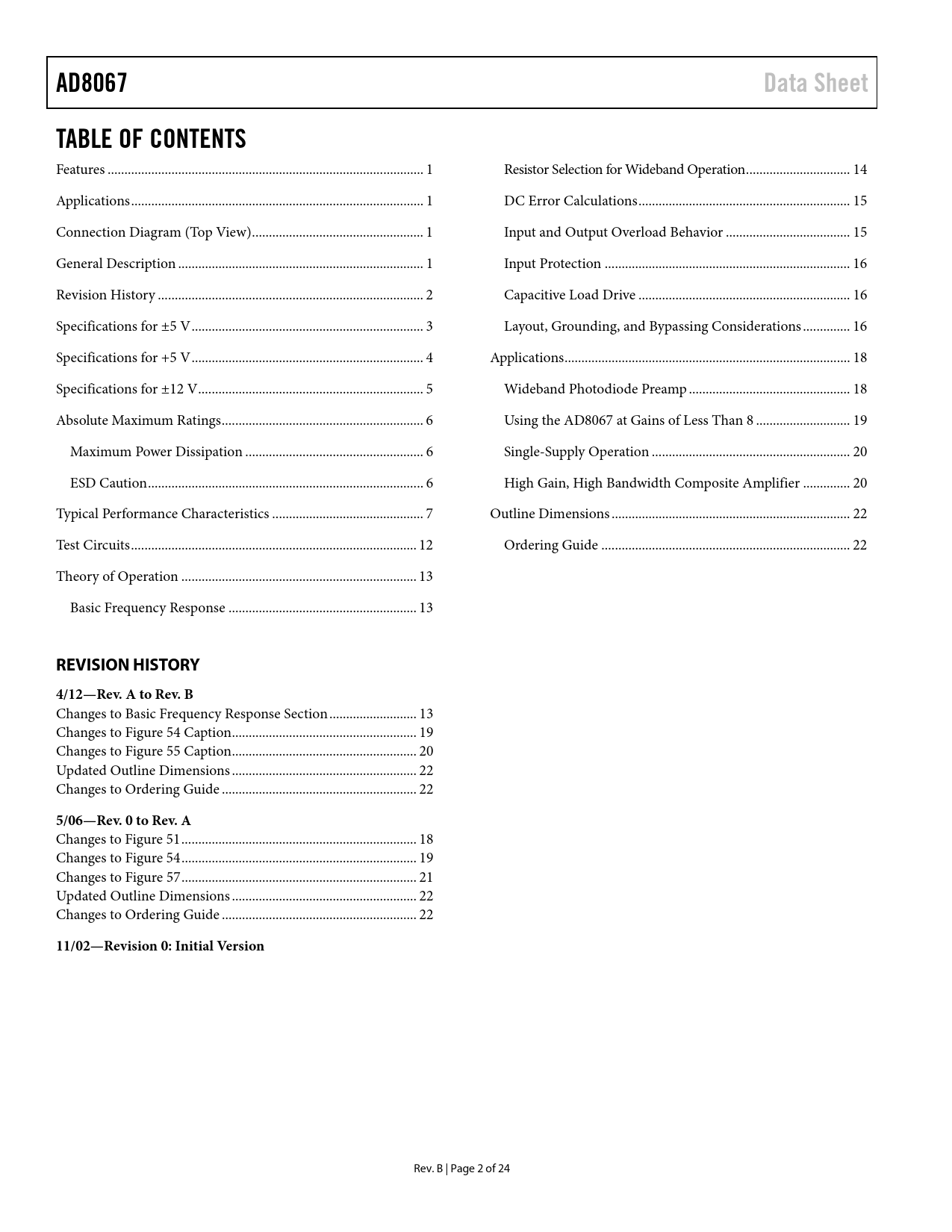 Pages / Page24 / 2 — AD8067. Data Sheet. TABLE OF CONTENTS. REVISION HISTORY. 4/12—Rev. A to …