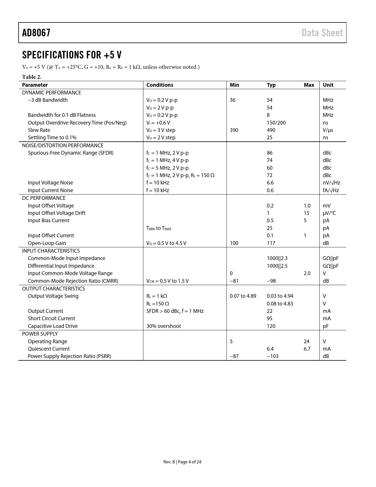 Pages / Page24 / 4 — AD8067. Data Sheet. SPECIFICATIONS FOR +5 V. Table 2. Parameter. …