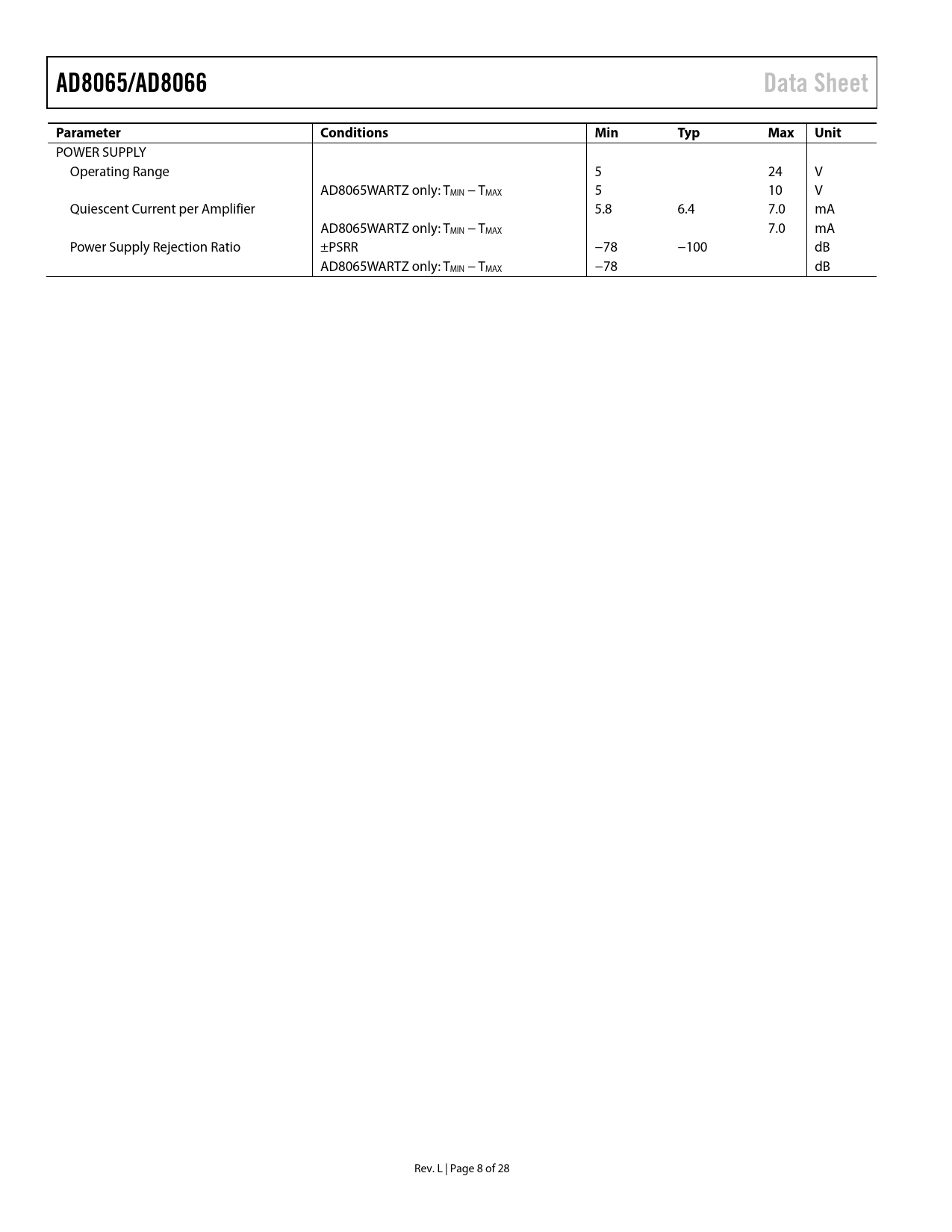 Pages / Page28 / 8 — AD8065/AD8066. Data Sheet. Parameter. Conditions. Min. Typ. Max. Unit