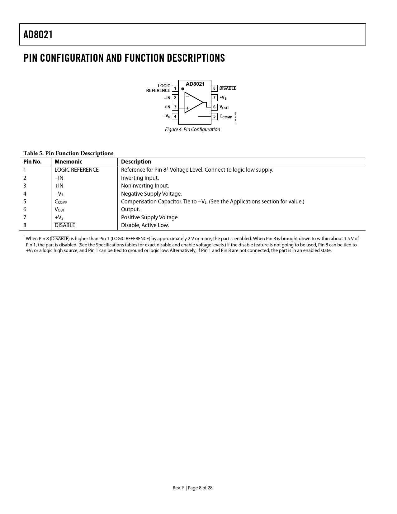 AD8021. PIN CONFIGURATION AND FUNCTION DESCRIPTIONS. LOGIC. REFERENCE. DISABLE. –IN 2. 7 +VS. +IN 3. 6 VOUT. –VS 4. 5 CCOMP