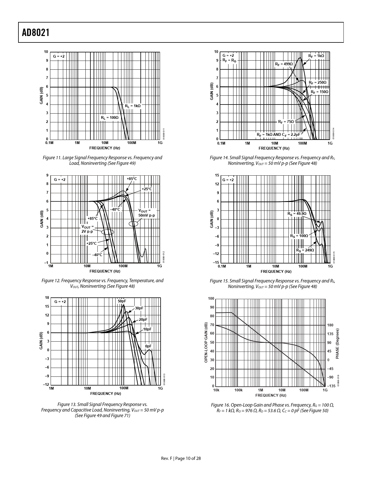 link to page 17 link to page 17 link to page 17 link to page 24 link to page 17 link to page 17 link to page 17 AD80211010G = +2G = +2RF = 1kΩ99RF = RGRF = 499Ω8877)RF = 250Ω) 6B 6Bdd(R(F = 150Ω5IN 5INGAGA 4R4L = 1kΩ33RL = 100Ω22RF = 75Ω1 4 11 0 1 -01 8- R 88 88 F = 1kΩ AND CF = 2.2pF0 01 0 018 0.1M1M10M100M1G0.1M1M10M100M1GFREQUENCY (Hz)FREQUENCY (Hz) Figure 11. Large Signal Frequency Response vs. Frequency and Figure 14. Small Signal Frequency Response vs. Frequency and RF, Load, Noninverting (See Figure 49) Noninverting, VOUT = 50 mV p-p (See Figure 48) 915G = +2+85°CG = +2812+25°C7966) 5–40°CV)3BOUT =Bd50mV p-pdRS = 49.9Ω( 4+85°C(0ININGA 3VOUT =GA –32V p-p2–6RS = 100Ω1+25°C–9RS = 249Ω0–40°C 12 0 –12 15 0 8- 8- 88 88 –1 01 –15 01 1M10M100M1G0.1M1M10M100M1GFREQUENCY (Hz)FREQUENCY (Hz) Figure 12. Frequency Response vs. Frequency, Temperature, and Figure 15. Small Signal Frequency Response vs. Frequency and RS, VOUT, Noninverting (See Figure 48) Noninverting, VOUT = 50 mV p-p (See Figure 48) 18100G = +250pF1530pF90128020pF9B) 70d18010pF) B660135d (egrees)IN35090DGA0pFOOP GAIN (0L 40SE (45A–3PHOPEN- 300–620–45–9 13 0 10–90 8- 88 –12 01 0–135 01888-016 1M10M100M1G10k100k1M10M100M1GFREQUENCY (Hz)FREQUENCY (Hz) Figure 13. Small Signal Frequency Response vs. Figure 16. Open-Loop Gain and Phase vs. Frequency, RG = 100 Ω, Frequency and Capacitive Load, Noninverting, VOUT = 50 mV p-p RF = 1 kΩ, RO = 976 Ω, RD = 53.6 Ω, CC = 0 pF (See Figure 50) (See Figure 49 and Figure 71) Rev. F | Page 10 of 28 Document Outline FEATURES APPLICATIONS GENERAL DESCRIPTION CONNECTION DIAGRAM TABLE OF CONTENTS REVISION HISTORY SPECIFICATIONS ABSOLUTE MAXIMUM RATINGS MAXIMUM POWER DISSIPATION ESD CAUTION PIN CONFIGURATION AND FUNCTION DESCRIPTIONS TYPICAL PERFORMANCE CHARACTERISTICS TEST CIRCUITS APPLICATIONS USING THE DISABLE FEATURE THEORY OF OPERATION PCB LAYOUT CONSIDERATIONS DRIVING 16-BIT ADCs DIFFERENTIAL DRIVER USING THE AD8021 IN ACTIVE FILTERS DRIVING CAPACITIVE LOADS OUTLINE DIMENSIONS ORDERING GUIDE