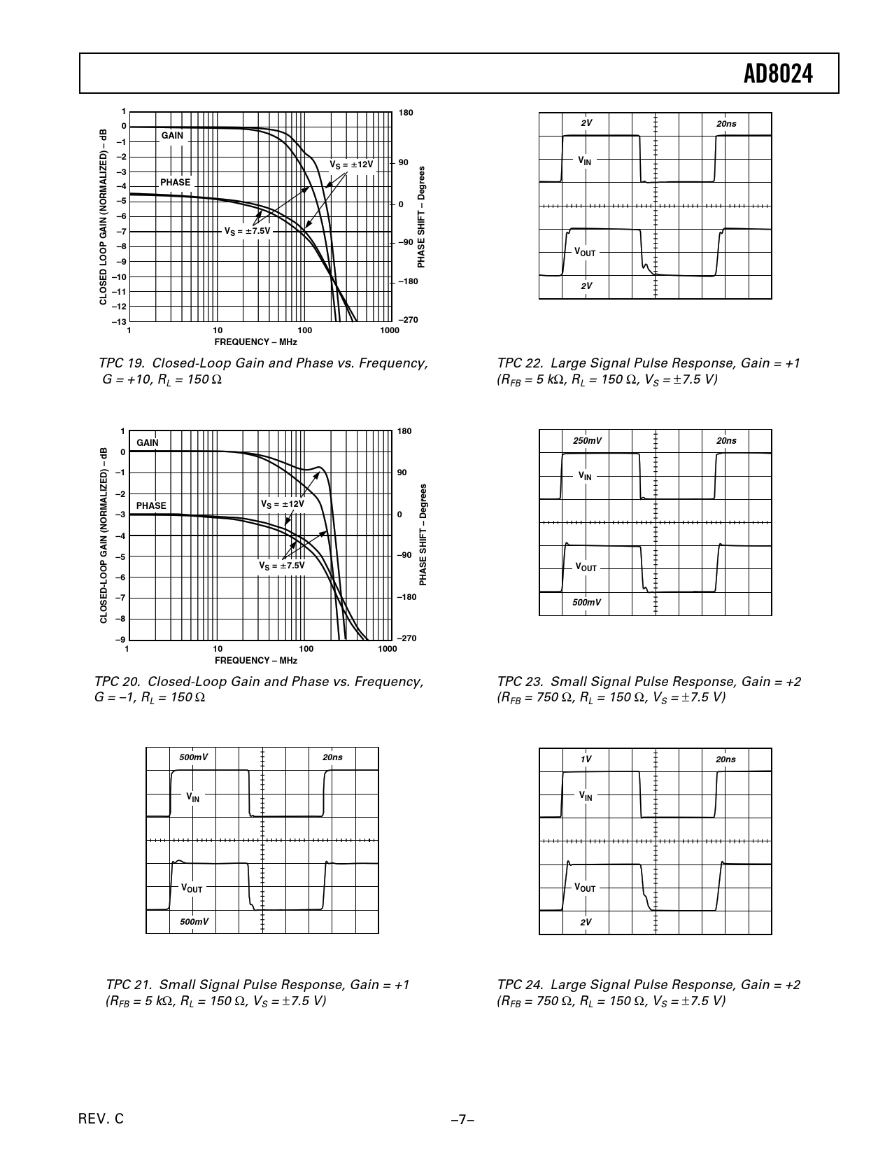 AD8024. 180. 20ns. GAIN. dB –. S =. 12V. PHASE. Degrees. VS =. 7.5V. –90. VOUT. PHASE SHIFT. –10. –180. –11. CLOSED LOOP GAIN (NORMALIZED) –12. –270. –13. 100