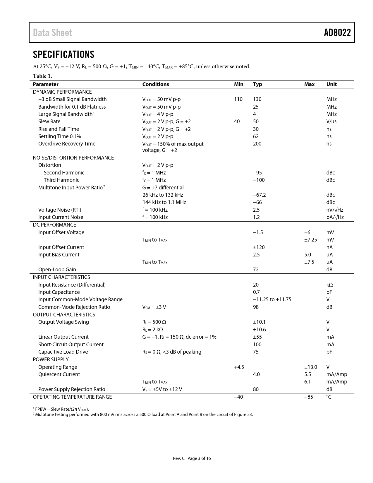 Pages / Page16 / 3 — Data Sheet. AD8022. SPECIFICATIONS. Table 1. Parameter Conditions. Min. …