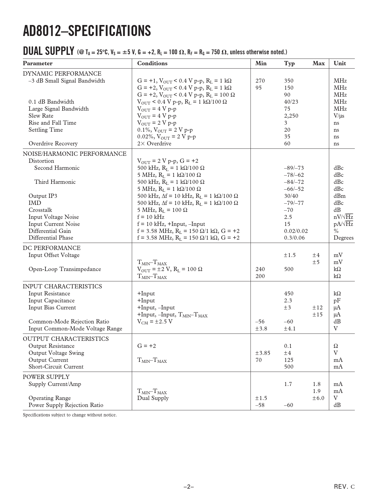 AD8012–SPECIFICATIONS. DUAL SUPPLY (@ TA = 25. C, VS =. 5 V, G = +2, RL = 100. , RF = RG = 750
