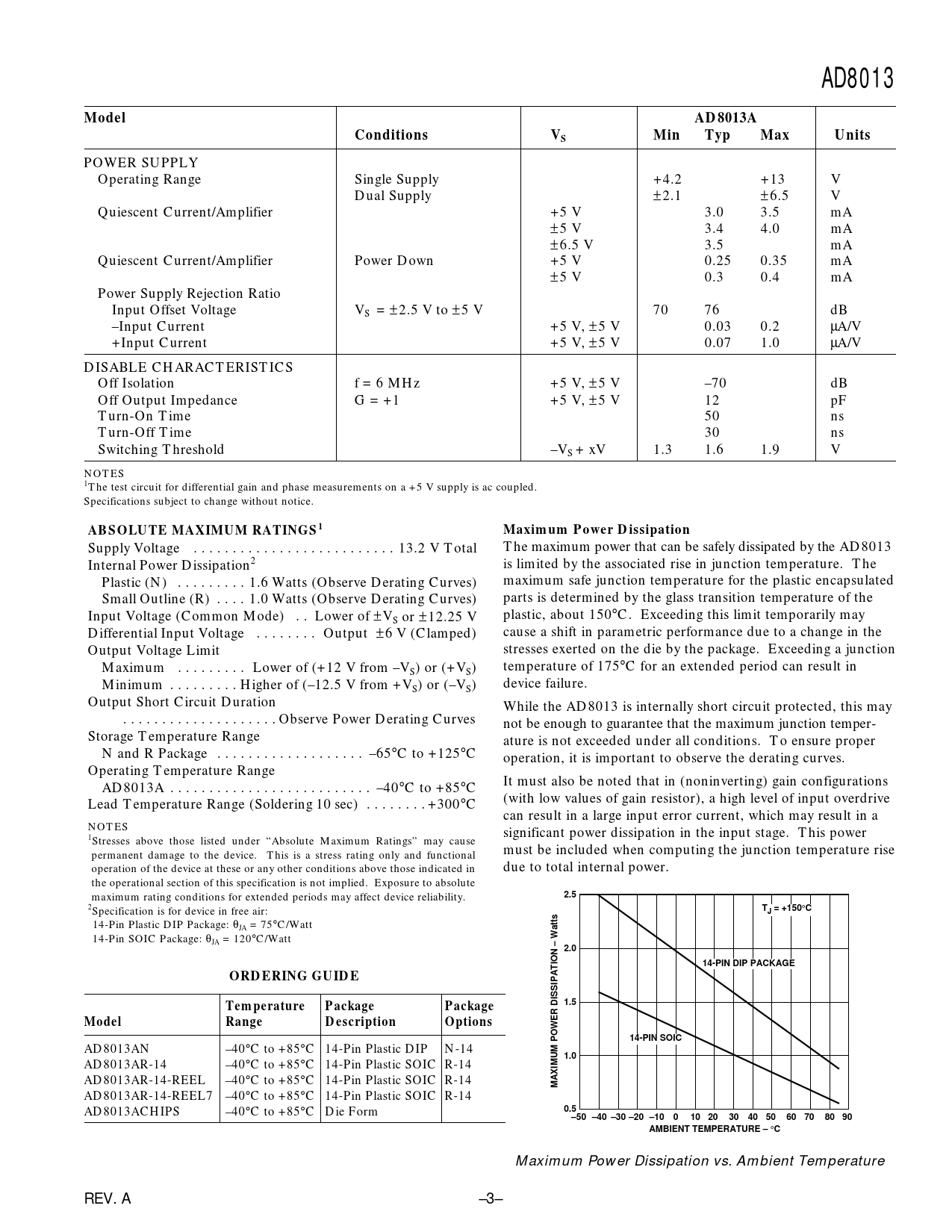 AD8013ModelAD8013AConditionsVSMinTypMaxUnits POWER SUPPLY Operating Range Single Supply +4.2 +13 V Dual Supply ±2.1 ±6.5 V Quiescent Current/Amplifier +5 V 3.0 3.5 mA ±5 V 3.4 4.0 mA ±6.5 V 3.5 mA Quiescent Current/Amplifier Power Down +5 V 0.25 0.35 mA ±5 V 0.3 0.4 mA Power Supply Rejection Ratio Input Offset Voltage VS = ± 2.5 V to ± 5 V 70 76 dB –Input Current +5 V, ± 5 V 0.03 0.2 µA/V +Input Current +5 V, ± 5 V 0.07 1.0 µA/V DISABLE CHARACTERISTICS Off Isolation f = 6 MHz +5 V, ± 5 V –70 dB Off Output Impedance G = +1 +5 V, ± 5 V 12 pF Turn-On Time 50 ns Turn-Off Time 30 ns Switching Threshold –VS + xV 1.3 1.6 1.9 V NOTES 1The test circuit for differential gain and phase measurements on a +5 V supply is ac coupled. Specifications subject to change without notice. ABSOLUTE MAXIMUM RATINGS1Maximum Power Dissipation Supply Voltage . 13.2 V Total The maximum power that can be safely dissipated by the AD8013 Internal Power Dissipation2 is limited by the associated rise in junction temperature. The Plastic (N) . 1.6 Watts (Observe Derating Curves) maximum safe junction temperature for the plastic encapsulated Small Outline (R) . 1.0 Watts (Observe Derating Curves) parts is determined by the glass transition temperature of the Input Voltage (Common Mode) . Lower of ± V plastic, about 150°C. Exceeding this limit temporarily may S or ± 12.25 V Differential Input Voltage . Output ± 6 V (Clamped) cause a shift in parametric performance due to a change in the Output Voltage Limit stresses exerted on the die by the package. Exceeding a junction Maximum . Lower of (+12 V from –V temperature of 175°C for an extended period can result in S) or (+VS) Minimum . Higher of (–12.5 V from +V device failure. S) or (–VS) Output Short Circuit Duration While the AD8013 is internally short circuit protected, this may . Observe Power Derating Curves not be enough to guarantee that the maximum junction temper- Storage Temperature Range ature is not exceeded under all conditions. To ensure proper N and R Package . –65°C to +125°C operation, it is important to observe the derating curves. Operating Temperature Range AD8013A . –40°C to +85°C It must also be noted that in (noninverting) gain configurations Lead Temperature Range (Soldering 10 sec) . +300°C (with low values of gain resistor), a high level of input overdrive can result in a large input error current, which may result in a NOTES significant power dissipation in the input stage. This power 1Stresses above those listed under “Absolute Maximum Ratings” may cause permanent damage to the device. This is a stress rating only and functional must be included when computing the junction temperature rise operation of the device at these or any other conditions above those indicated in due to total internal power. the operational section of this specification is not implied. Exposure to absolute maximum rating conditions for extended periods may affect device reliability. 2.5 2Specification is for device in free air: TJ = +150 ° C 14-Pin Plastic DIP Package: θJA = 75°C/Watt 14-Pin SOIC Package: θJA = 120°C/Watt 2.014-PIN DIP PACKAGEORDERING GUIDETemperaturePackagePackage1.5ModelRangeDescriptionOptions14-PIN SOIC AD8013AN –40°C to +85°C 14-Pin Plastic DIP N-14 1.0 AD8013AR-14 –40°C to +85°C 14-Pin Plastic SOIC R-14 AD8013AR-14-REEL –40°C to +85°C 14-Pin Plastic SOIC R-14 MAXIMUM POWER DISSIPATION – Watts AD8013AR-14-REEL7 –40°C to +85°C 14-Pin Plastic SOIC R-14 AD8013ACHIPS –40°C to +85°C Die Form 0.5–50 –40 –30 –20 –10010 203040 5060 7080 90AMBIENT TEMPERATURE – ° C Maximum Power Dissipation vs. Ambient Temperature REV. A –3–