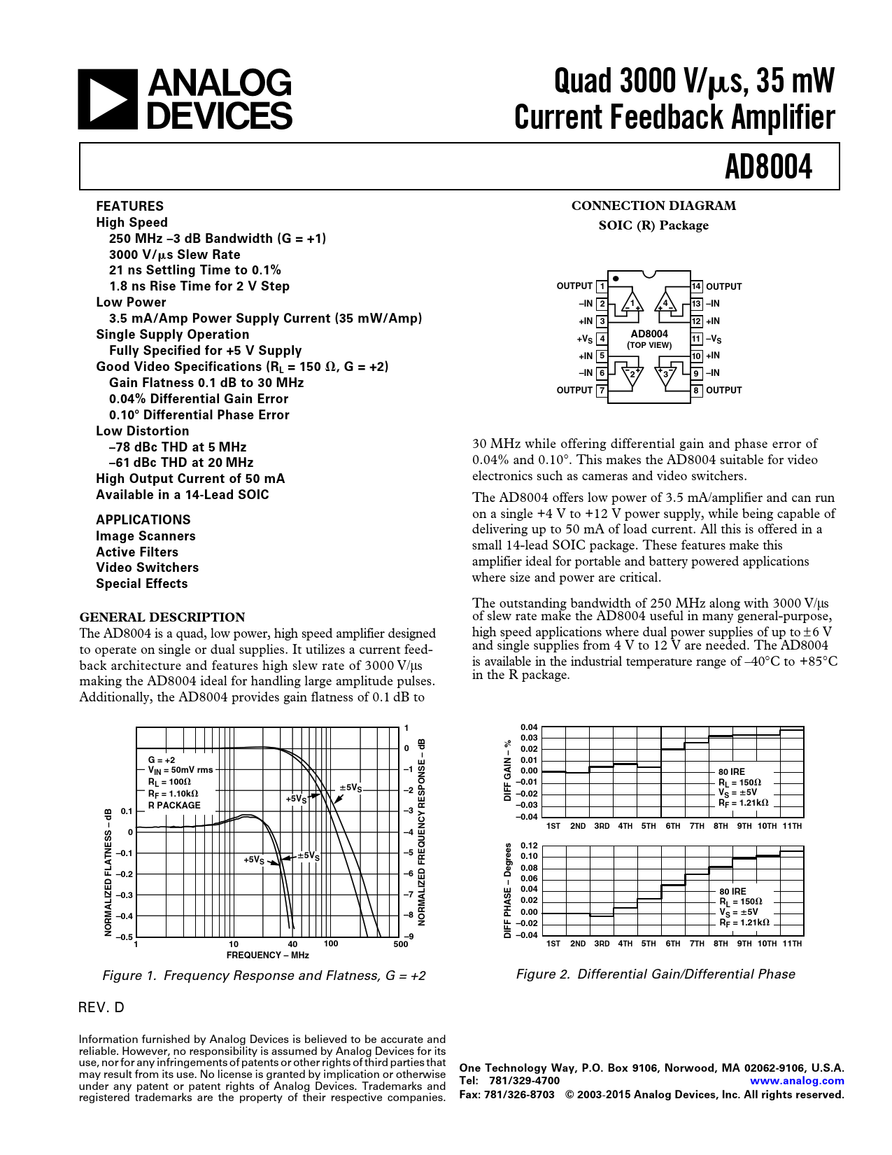 Figure 1. Frequency Response and Flatness, G = +2 Figure 2. Differential Gain/Differential Phase REV. D Information furnished by Analog Devices is believed to be accurate and reliable. However, no responsibility is assumed by Analog Devices for its use, nor for any infringements of patents or other rights of third parties that