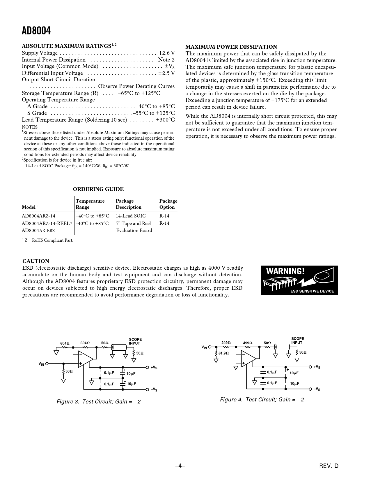 ESD (electrostatic discharge) sensitive device. Electrostatic charges as high as 4000 V readily accumulate on the human body and test equipment and can discharge without detection. Although the AD8004 features proprietary ESD protection circuitry, permanent damage may occur on devices subjected to high energy electrostatic discharges. Therefore, proper ESD precautions are recommended to avoid performance degradation or loss of functionality.