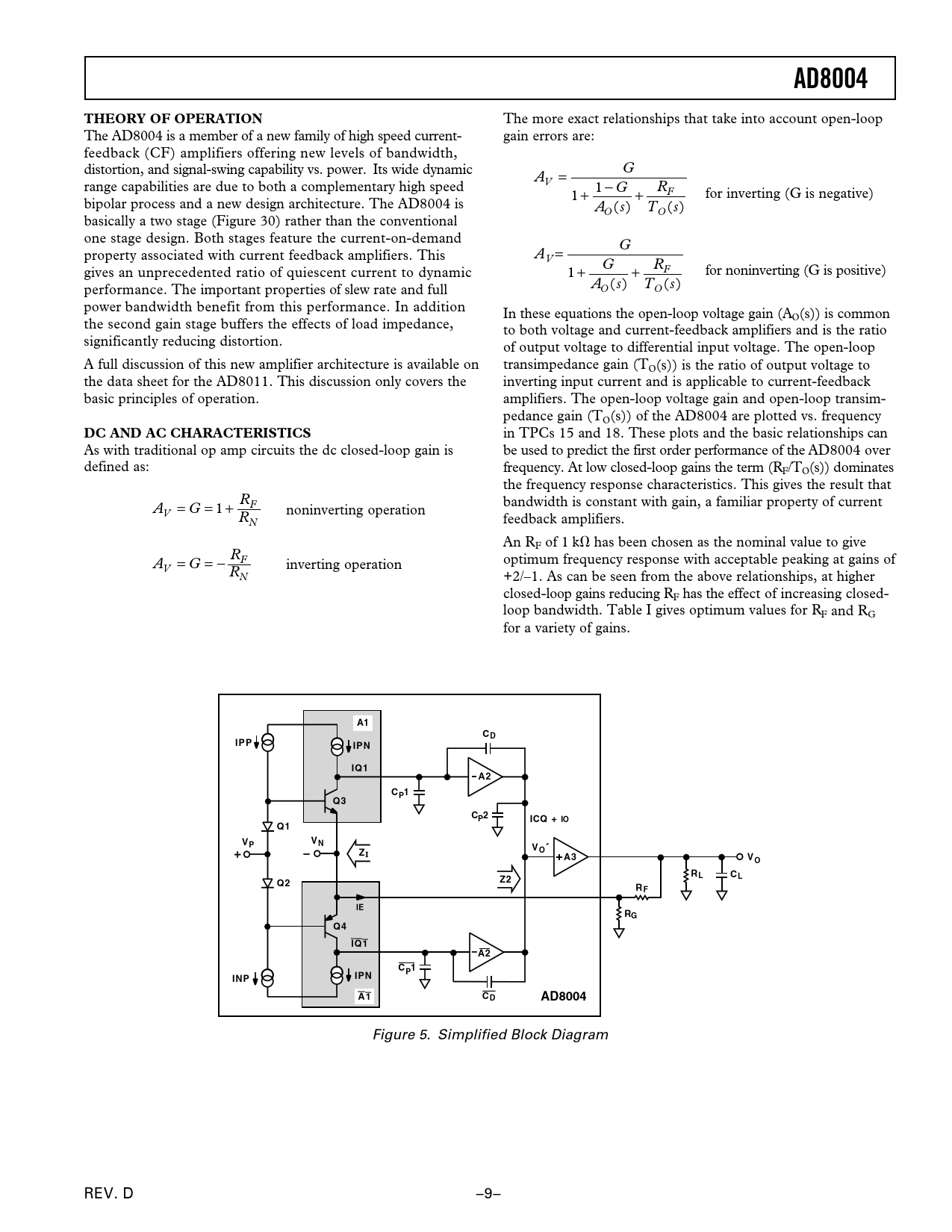 AD8004THEORY OF OPERATION The more exact relationships that take into account open-loop The AD8004 is a member of a new family of high speed current- gain errors are: feedback (CF) amplifiers offering new levels of bandwidth, distortion, and signal-swing capability vs. power. Its wide dynamic A = G range capabilities are due to both a complementary high speed V 1 + 1 − G + RF for inverting (G is negative) bipolar process and a new design architecture. The AD8004 is A (s) T (s) O O basically a two stage (Figure 30) rather than the conventional one stage design. Both stages feature the current-on-demand property associated with current feedback amplifiers. This A = G V gives an unprecedented ratio of quiescent current to dynamic 1 + G + RF for noninverting (G is positive) performance. The important properties of slew rate and full A (s) T (s) O O power bandwidth benefit from this performance. In addition In these equations the open-loop voltage gain (AO(s)) is common the second gain stage buffers the effects of load impedance, to both voltage and current-feedback amplifiers and is the ratio significantly reducing distortion. of output voltage to differential input voltage. The open-loop A full discussion of this new amplifier architecture is available on transimpedance gain (TO(s)) is the ratio of output voltage to the data sheet for the AD8011. This discussion only covers the inverting input current and is applicable to current-feedback basic principles of operation. amplifiers. The open-loop voltage gain and open-loop transim- pedance gain (TO(s)) of the AD8004 are plotted vs. frequency DC AND AC CHARACTERISTICS in TPCs 15 and 18. These plots and the basic relationships can As with traditional op amp circuits the dc closed-loop gain is be used to predict the first order performance of the AD8004 over defined as: frequency. At low closed-loop gains the term (RF/TO(s)) dominates the frequency response characteristics. This gives the result that bandwidth is constant with gain, a familiar property of current A = G = 1+ RF V noninverting operation RN feedback amplifiers. An RF of 1 k⍀ has been chosen as the nominal value to give A = G = − RF optimum frequency response with acceptable peaking at gains of V inverting operation RN +2/–1. As can be seen from the above relationships, at higher closed-loop gains reducing RF has the effect of increasing closed- loop bandwidth. Table I gives optimum values for RF and RG for a variety of gains. A1CDIPPIPNIQ1A2CP1Q3CP2ICQ + IOQ1VVPNVZO´IA3VORLCLQ2Z2RFIERGQ4IQ1A2CP1INPIPNA1CDAD8004 Figure 5. Simplified Block Diagram REV. D –9– Document Outline FEATURES APPLICATIONS GENERAL DESCRIPTION CONNECTION DIAGRAM SPECIFICATIONS ABSOLUTE MAXIMUM RATINGS ORDERING GUIDE MAXIMUM POWER DISSIPATION Typical Performance Characteristics THEORY OF OPERATION DC AND AC CHARACTERISTICS DRIVING CAPACITIVE LOADS OPTIMIZING FLATNESS DRIVING A SINGLE-SUPPLY A/D CONVERTER LAYOUT CONSIDERATIONS OUTLINE DIMENSIONS Revision History