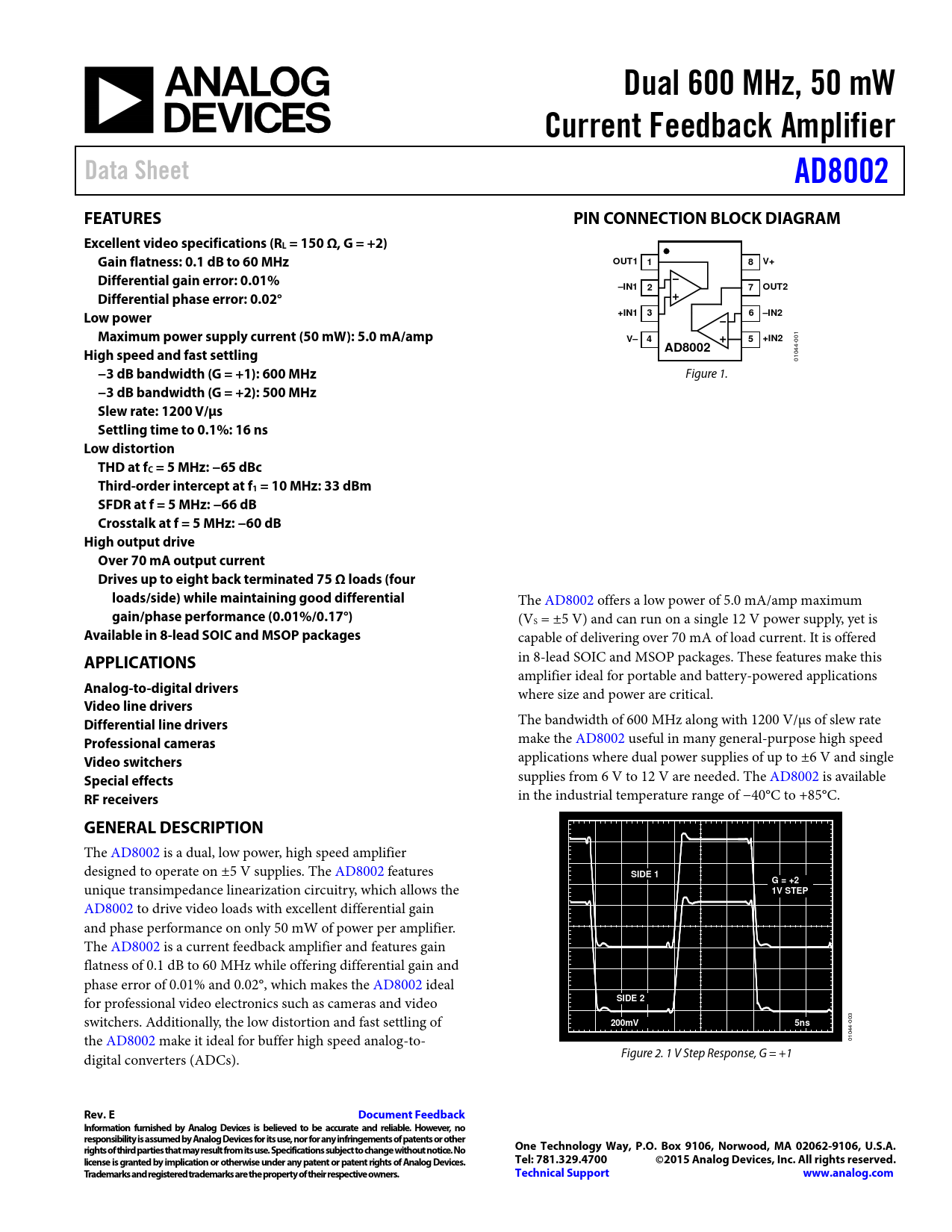 Dual 600 MHz, 50 mW. Current Feedback Amplifier. Data Sheet. AD8002. FEATURES. PIN CONNECTION BLOCK DIAGRAM