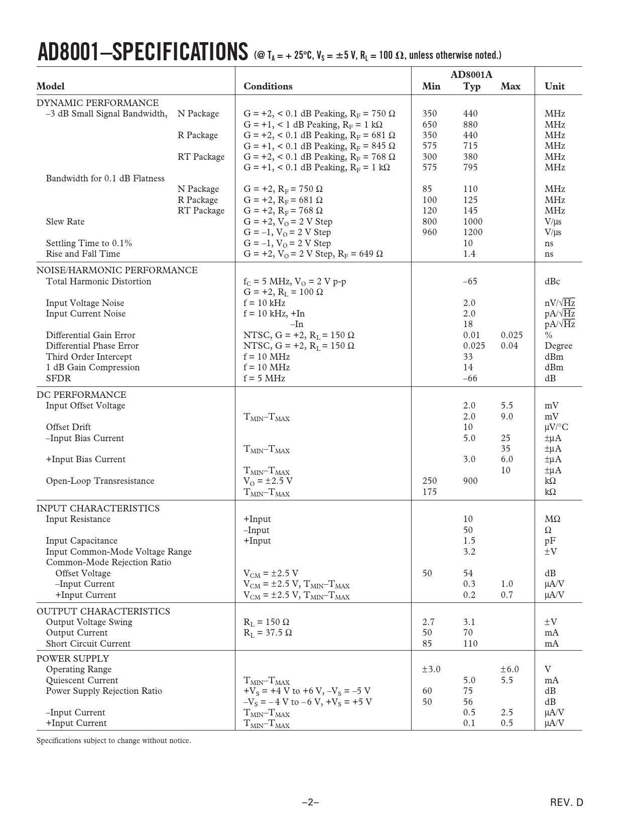 AD8001–SPECIFICATIONS (@ TA = + 25C, VS =5 V, RL = 100, unless otherwise noted.)AD8001AModelConditionsMinTypMaxUnit DYNAMIC PERFORMANCE –3 dB Small Signal Bandwidth, N Package G = +2, < 0.1 dB Peaking, RF = 750 Ω 350 440 MHz G = +1, < 1 dB Peaking, RF = 1 kΩ 650 880 MHz R Package G = +2, < 0.1 dB Peaking, RF = 681 Ω 350 440 MHz G = +1, < 0.1 dB Peaking, RF = 845 Ω 575 715 MHz RT Package G = +2, < 0.1 dB Peaking, RF = 768 Ω 300 380 MHz G = +1, < 0.1 dB Peaking, RF = 1 kΩ 575 795 MHz Bandwidth for 0.1 dB Flatness N Package G = +2, RF = 750 Ω 85 110 MHz R Package G = +2, RF = 681 Ω 100 125 MHz RT Package G = +2, RF = 768 Ω 120 145 MHz Slew Rate G = +2, VO = 2 V Step 800 1000 V/µs G = –1, VO = 2 V Step 960 1200 V/µs Settling Time to 0.1% G = –1, VO = 2 V Step 10 ns Rise and Fall Time G = +2, VO = 2 V Step, RF = 649 Ω 1.4 ns NOISE/HARMONIC PERFORMANCE Total Harmonic Distortion fC = 5 MHz, VO = 2 V p-p –65 dBc G = +2, RL = 100 Ω Input Voltage Noise f = 10 kHz 2.0 nV/√Hz Input Current Noise f = 10 kHz, +In 2.0 pA/√Hz –In 18 pA/√Hz Differential Gain Error NTSC, G = +2, RL = 150 Ω 0.01 0.025 % Differential Phase Error NTSC, G = +2, RL = 150 Ω 0.025 0.04 Degree Third Order Intercept f = 10 MHz 33 dBm 1 dB Gain Compression f = 10 MHz 14 dBm SFDR f = 5 MHz –66 dB DC PERFORMANCE Input Offset Voltage 2.0 5.5 mV TMIN–TMAX 2.0 9.0 mV Offset Drift 10 µV/°C –Input Bias Current 5.0 25 ±µA TMIN–TMAX 35 ±µA +Input Bias Current 3.0 6.0 ±µA TMIN–TMAX 10 ±µA Open-Loop Transresistance VO = ± 2.5 V 250 900 kΩ TMIN–TMAX 175 kΩ INPUT CHARACTERISTICS Input Resistance +Input 10 MΩ –Input 50 Ω Input Capacitance +Input 1.5 pF Input Common-Mode Voltage Range 3.2 ±V Common-Mode Rejection Ratio Offset Voltage VCM = ± 2.5 V 50 54 dB –Input Current VCM = ± 2.5 V, TMIN–TMAX 0.3 1.0 µA/V +Input Current VCM = ± 2.5 V, TMIN–TMAX 0.2 0.7 µA/V OUTPUT CHARACTERISTICS Output Voltage Swing RL = 150 Ω 2.7 3.1 ±V Output Current RL = 37.5 Ω 50 70 mA Short Circuit Current 85 110 mA POWER SUPPLY Operating Range ±3.0 ±6.0 V Quiescent Current TMIN–TMAX 5.0 5.5 mA Power Supply Rejection Ratio +VS = +4 V to +6 V, –VS = –5 V 60 75 dB –VS = – 4 V to – 6 V, +VS = +5 V 50 56 dB –Input Current TMIN–TMAX 0.5 2.5 µA/V +Input Current TMIN–TMAX 0.1 0.5 µA/V Specifications subject to change without notice. –2– REV. D Document Outline FEATURES APPLICATIONS GENERAL DESCRIPTION FUNCTIONAL BLOCK DIAGRAMS SPECIFICATIONS ABSOLUTE MAXIMUM RATINGS ORDERING GUIDE MAXIMUM POWER DISSIPATION Typical Performance Characteristics THEORY OF OPERATION Choice of Feedback and Gain Resistors Printed Circuit Board Layout Considerations Power Supply Bypassing DC Errors and Noise Driving Capacitive Loads Communications Operation as a Video Line Driver Driving A-to-D Converters Layout Considerations OUTLINE DIMENSIONS Revision History