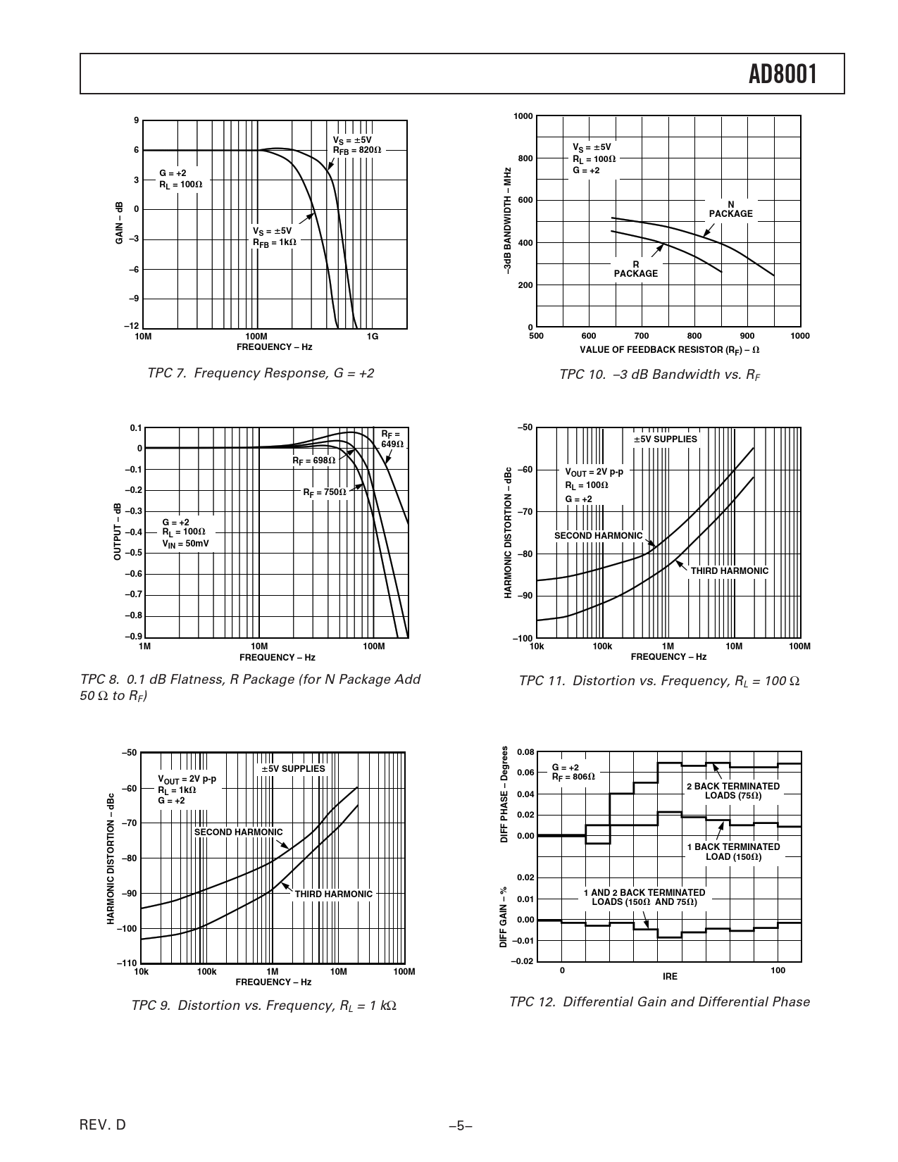 AD8001 1000 9 VS = 5V 6 R V FB = 820 S = 5V 800 RL = 100 G = +2 G = +2 3 RL = 100 600 N 0 PACKAGE VS = 5V GAIN – dB –3 RFB = 1k 400 R –6 –3dB BANDWIDTH – MHz PACKAGE 200 –9 –12 0 10M 100M 1G 500 600 700 800 900 1000 FREQUENCY – Hz VALUE OF FEEDBACK RESISTOR (RF) –