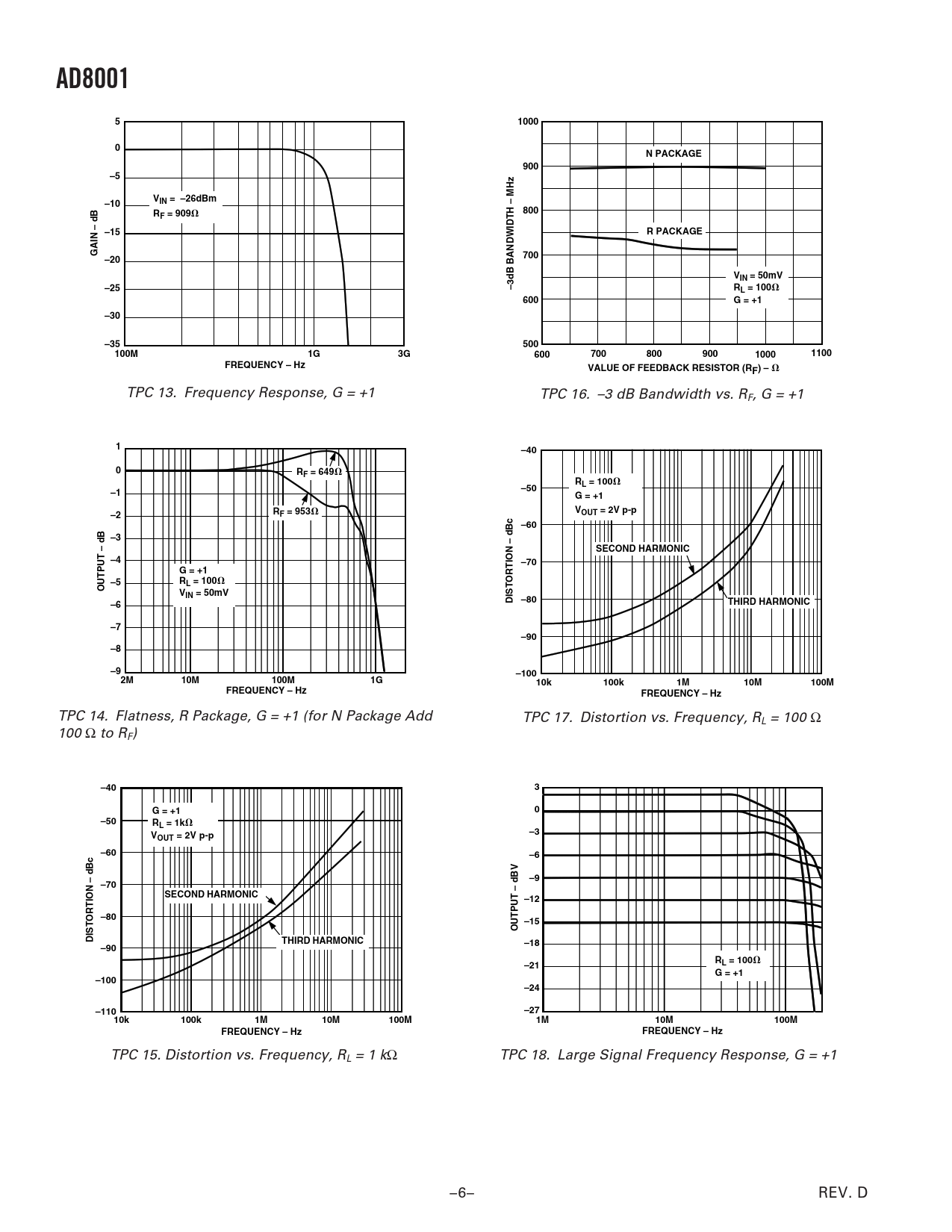 TPC 13. Frequency Response, G = +1 TPC 16. –3 dB Bandwidth vs. RF, G = +1