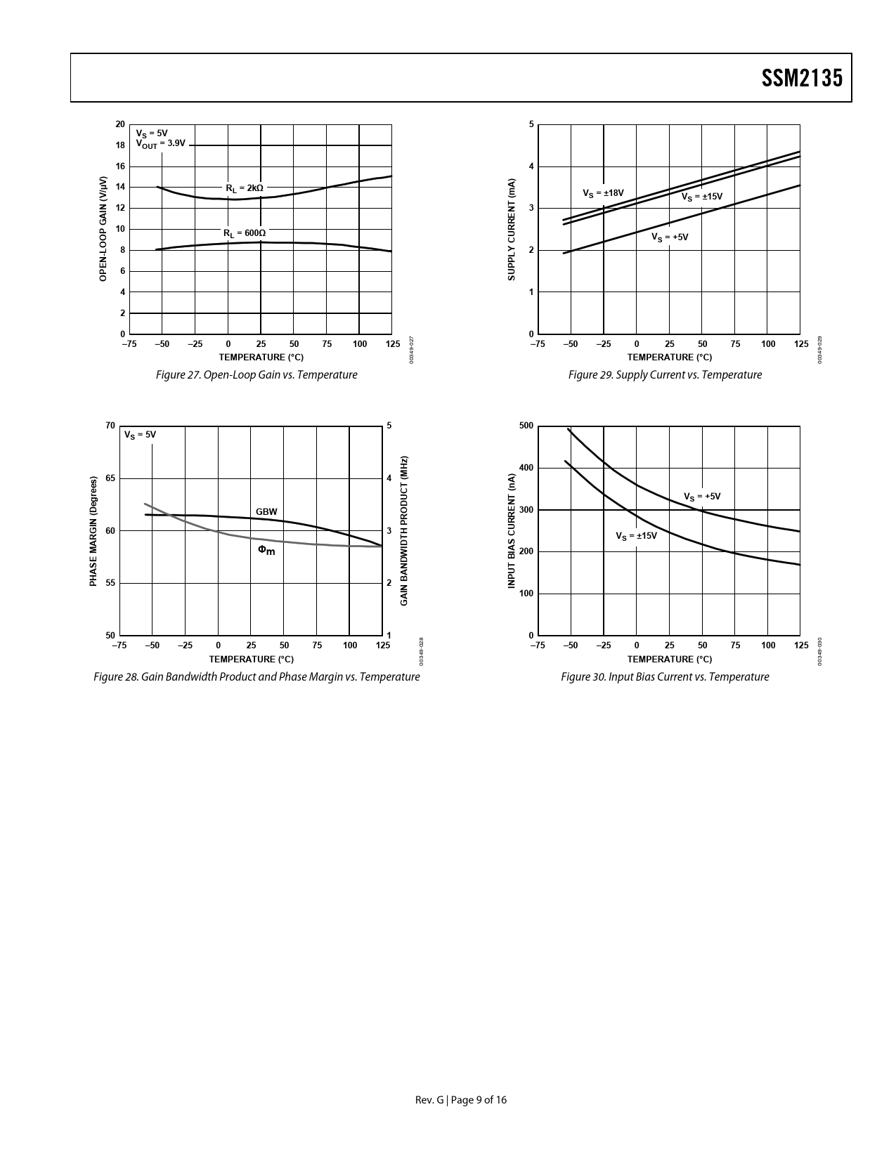 SSM2135. VS = 5V. VOUT = 3.9V. /µV. L = 2kΩ. VS = ±18V. VS = ±15V. IN 12. GA 10. RL = 600Ω. VS = +5V. OOP. CURR. –75. –50. –25. 100. 125. TEMPERATURE (°C)