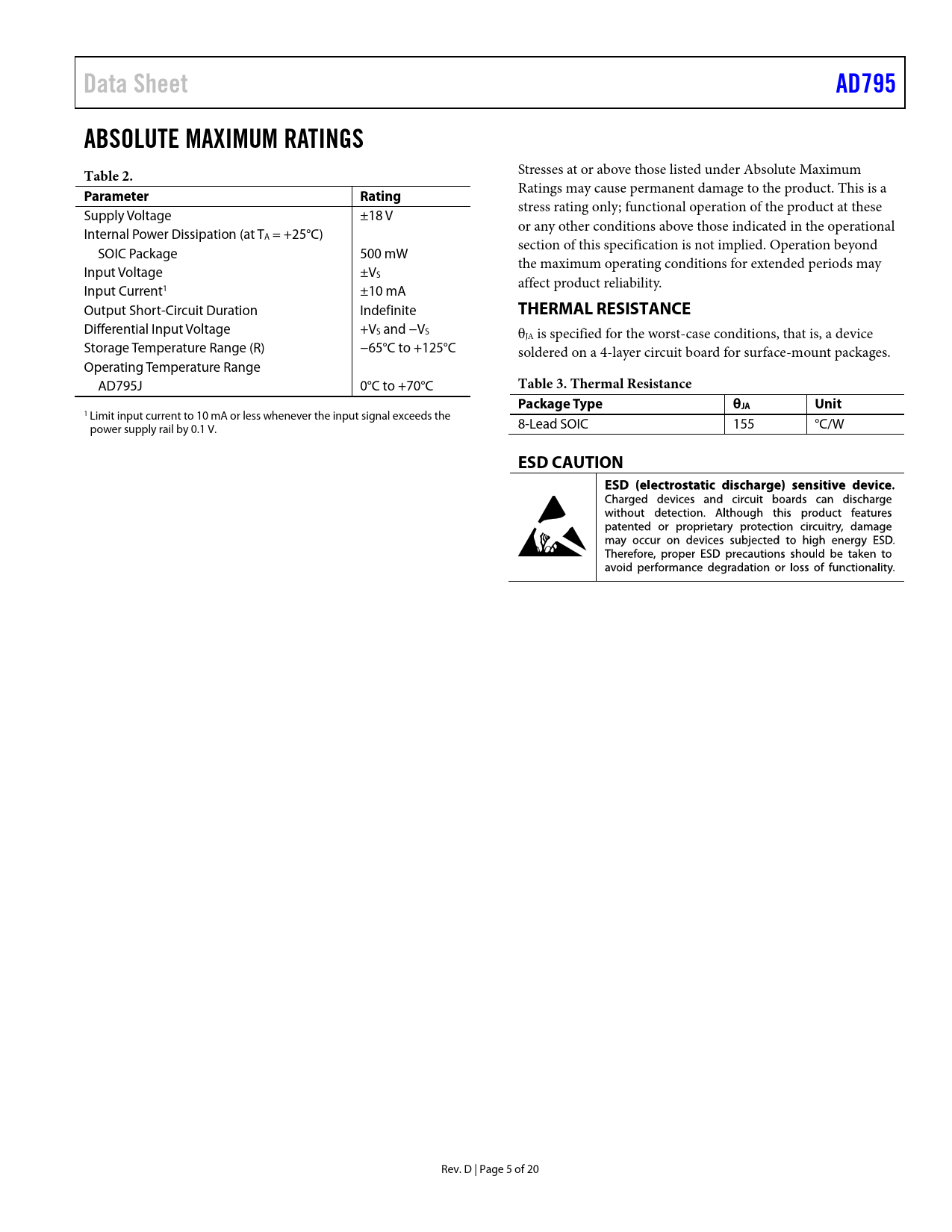 Data Sheet AD795 ABSOLUTE MAXIMUM RATINGS Table 2 Parameter Rating THERMAL RESISTANCE Table 3 Thermal Resistance Package Type