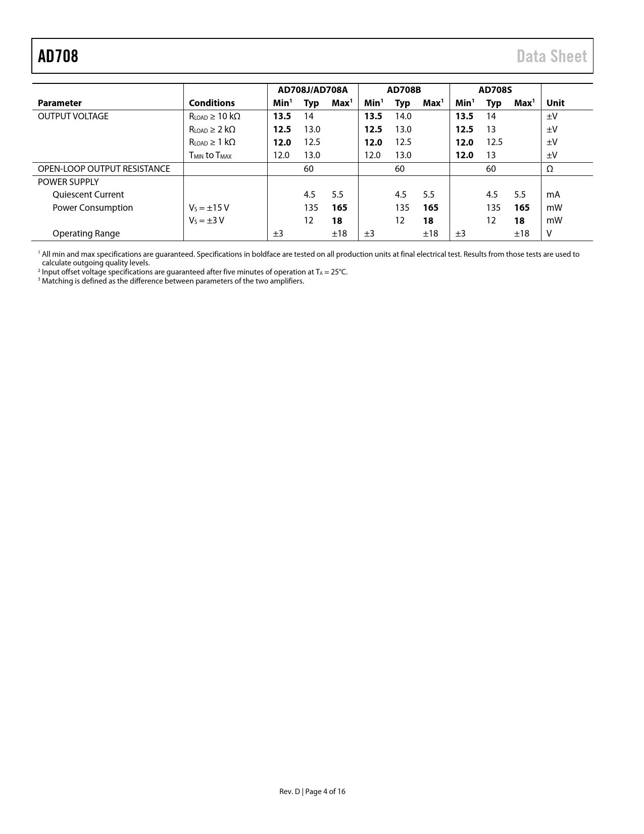 AD708Data SheetAD708J/AD708AAD708BAD708SParameterConditionsMin1 Typ Max1 Min1 Typ Max1 Min1 Typ Max1 Unit OUTPUT VOLTAGE RLOAD ≥ 10 kΩ 13.5 14 13.5 14.0 13.5 14 ±V RLOAD ≥ 2 kΩ 12.5 13.0 12.5 13.0 12.5 13 ±V RLOAD ≥ 1 kΩ 12.0 12.5 12.0 12.5 12.0 12.5 ±V TMIN to TMAX 12.0 13.0 12.0 13.0 12.0 13 ±V OPEN-LOOP OUTPUT RESISTANCE 60 60 60 Ω POWER SUPPLY Quiescent Current 4.5 5.5 4.5 5.5 4.5 5.5 mA Power Consumption VS = ±15 V 135 165 135 165 135 165 mW VS = ±3 V 12 18 12 18 12 18 mW Operating Range ±3 ±18 ±3 ±18 ±3 ±18 V 1 All min and max specifications are guaranteed. Specifications in boldface are tested on all production units at final electrical test. Results from those tests are used to calculate outgoing quality levels. 2 Input offset voltage specifications are guaranteed after five minutes of operation at TA = 25°C. 3 Matching is defined as the difference between parameters of the two amplifiers. Rev. D | Page 4 of 16 Document Outline Features Pin Configuration General Description Product Highlights Revision History Specifications Absolute Maximum Ratings ESD Caution Typical Performance Characteristics Matching Characteristics Theory of Operation Crosstalk Performance Operation with a Gain of −100 High Precision Programmable Gain Amplifier Bridge Signal Conditioner Precision Absolute Value Circuit Selection of Passive Components Outline Dimensions Ordering Guide