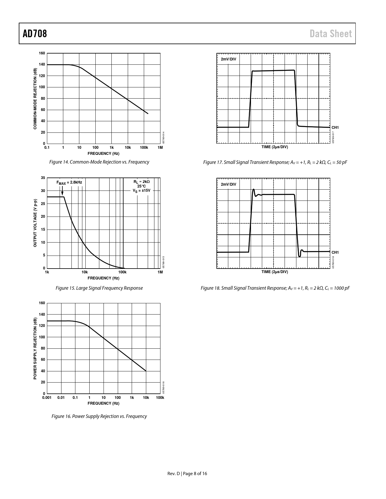 AD708. Data Sheet. 160. 2mV/DIV. 140. B) d 120. N ( IO CT 100 JE. DE O M. N- O M. CH1. 0.1. 100. 10k. 100k. TIME (2µs/DIV). FREQUENCY (Hz)