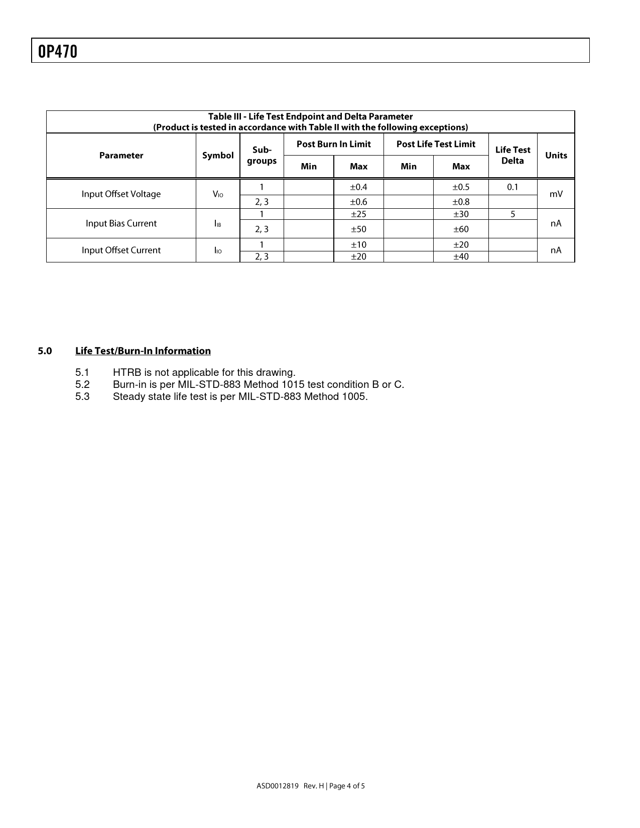 5.1. HTRB. is. not. applicable. for. this. drawing. 5.2. Burn-in. is. per. MIL-STD-883. Method. 1015. test. condition. B. or. C. 5.3. Steady. state. life. test. is. per