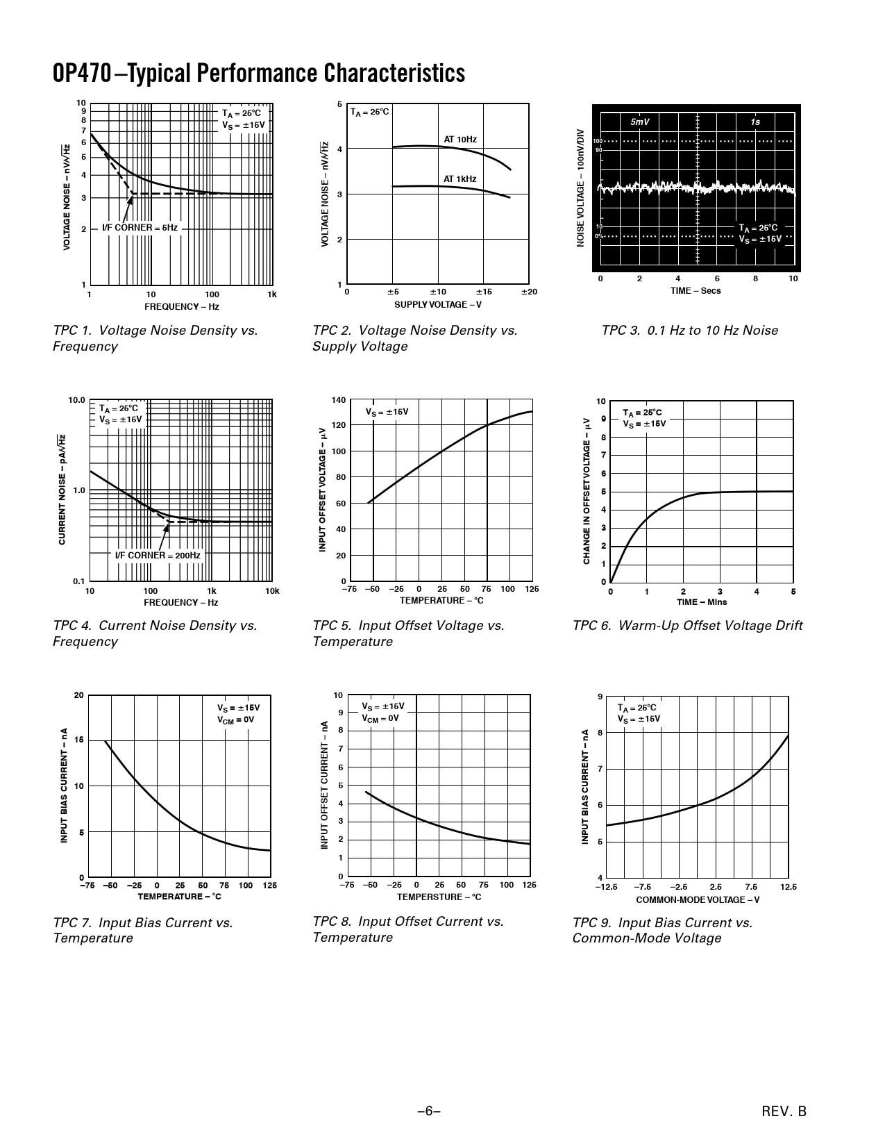 OP470 –Typical Performance Characteristics A = 25 5mV S = 15V 7 6 AT 10Hz 100 100nV/DIV AT 1kHz OISE – nV/ Hz I/F CORNER = 5Hz