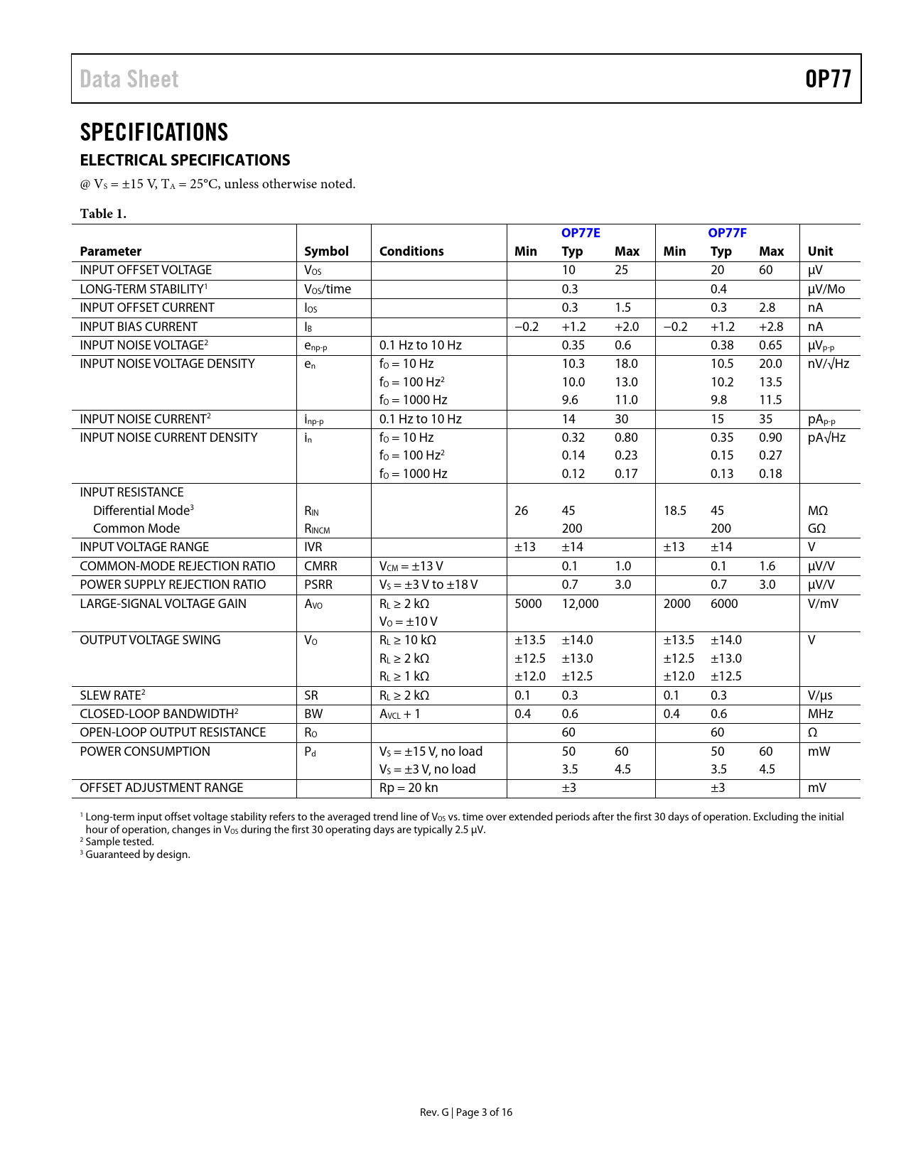 link to page 3 link to page 3 Data SheetOP77SPECIFICATIONS ELECTRICAL SPECIFICATIONS @ VS = ±15 V, TA = 25°C, unless otherwise noted. Table 1.OP77EOP77FParameterSymbolConditionsMinTypMaxMinTypMaxUnit INPUT OFFSET VOLTAGE VOS 10 25 20 60 μV LONG-TERM STABILITY1 VOS/time 0.3 0.4 μV/Mo INPUT OFFSET CURRENT IOS 0.3 1.5 0.3 2.8 nA INPUT BIAS CURRENT IB −0.2 +1.2 +2.0 −0.2 +1.2 +2.8 nA INPUT NOISE VOLTAGE2 enp-p 0.1 Hz to 10 Hz 0.35 0.6 0.38 0.65 μVp-p INPUT NOISE VOLTAGE DENSITY en fO = 10 Hz 10.3 18.0 10.5 20.0 nV/√Hz fO = 100 Hz2 10.0 13.0 10.2 13.5 fO = 1000 Hz 9.6 11.0 9.8 11.5 INPUT NOISE CURRENT2 inp-p 0.1 Hz to 10 Hz 14 30 15 35 pAp-p INPUT NOISE CURRENT DENSITY in fO = 10 Hz 0.32 0.80 0.35 0.90 pA√Hz fO = 100 Hz2 0.14 0.23 0.15 0.27 fO = 1000 Hz 0.12 0.17 0.13 0.18 INPUT RESISTANCE Differential Mode3 RIN 26 45 18.5 45 MΩ Common Mode RINCM 200 200 GΩ INPUT VOLTAGE RANGE IVR ±13 ±14 ±13 ±14 V COMMON-MODE REJECTION RATIO CMRR VCM = ±13 V 0.1 1.0 0.1 1.6 μV/V POWER SUPPLY REJECTION RATIO PSRR VS = ±3 V to ±18 V 0.7 3.0 0.7 3.0 μV/V LARGE-SIGNAL VOLTAGE GAIN AVO RL ≥ 2 kΩ 5000 12,000 2000 6000 V/mV VO = ±10 V OUTPUT VOLTAGE SWING VO RL ≥ 10 kΩ ±13.5 ±14.0 ±13.5 ±14.0 V RL ≥ 2 kΩ ±12.5 ±13.0 ±12.5 ±13.0 RL ≥ 1 kΩ ±12.0 ±12.5 ±12.0 ±12.5 SLEW RATE2 SR RL ≥ 2 kΩ 0.1 0.3 0.1 0.3 V/μs CLOSED-LOOP BANDWIDTH2 BW AVCL + 1 0.4 0.6 0.4 0.6 MHz OPEN-LOOP OUTPUT RESISTANCE RO 60 60 Ω POWER CONSUMPTION Pd VS = ±15 V, no load 50 60 50 60 mW VS = ±3 V, no load 3.5 4.5 3.5 4.5 OFFSET ADJUSTMENT RANGE Rp = 20 kn ±3 ±3 mV 1 Long-term input offset voltage stability refers to the averaged trend line of VOS vs. time over extended periods after the first 30 days of operation. Excluding the initial hour of operation, changes in VOS during the first 30 operating days are typically 2.5 μV. 2 Sample tested. 3 Guaranteed by design. Rev. G | Page 3 of 16 Document Outline Features Pin Connections General Description Table of Contents Revision History Specifications Electrical Specifications Wafer Test Limits Typical Electrical Characteristics Absolute Maximum Ratings Thermal Resistance ESD Caution Typical Performance Characteristics Test Circuits Applications Precision Current Sinks Outline Dimensions Ordering Guide