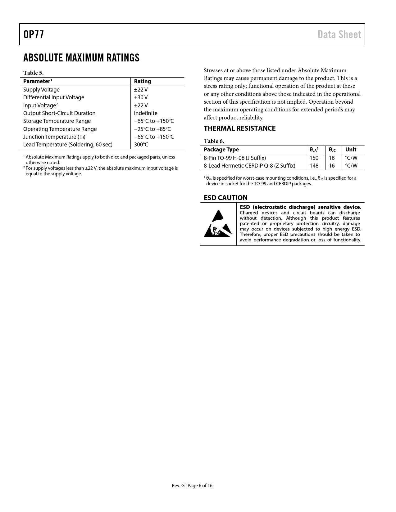 OP77. Data Sheet. ABSOLUTE MAXIMUM RATINGS Table 5. Parameter1. Rating. THERMAL RESISTANCE. Table 6. Package Type. θJA. θJC. Unit