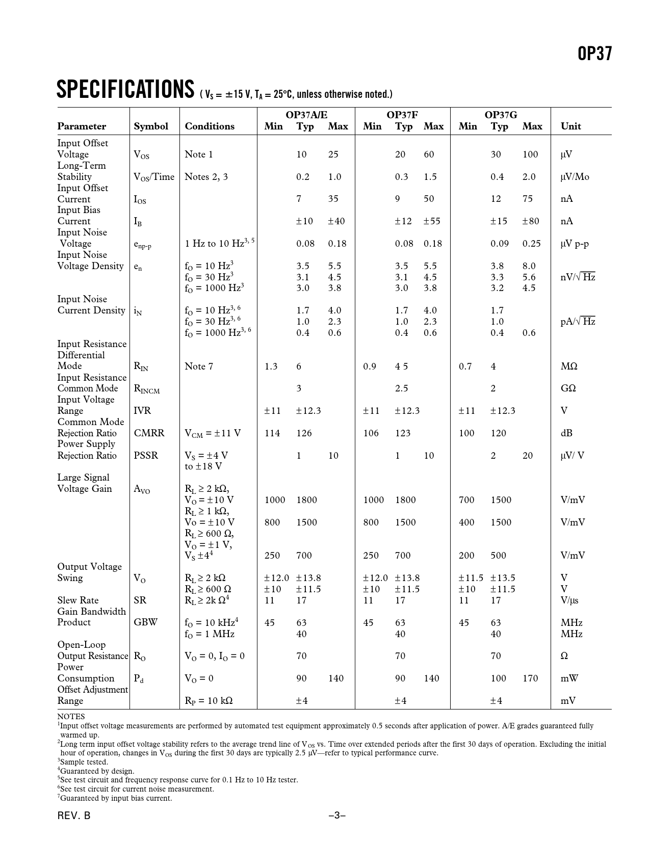 OP37SPECIFICATIONS ( VS =15 V, TA = 25C, unless otherwise noted.)OP37A/EOP37FOP37GParameterSymbolConditionsMinTypMaxMinTypMaxMinTypMaxUnit Input Offset Voltage VOS Note 1 10 25 20 60 30 100 mV Long-Term Stability VOS/Time Notes 2, 3 0.2 1.0 0.3 1.5 0.4 2.0 mV/Mo Input Offset Current IOS 7 35 9 50 12 75 nA Input Bias Current IB ±10 ±40 ±12 ±55 ±15 ±80 nA Input Noise Voltage enp-p 1 Hz to 10 Hz3, 5 0.08 0.18 0.08 0.18 0.09 0.25 mV p-p Input Noise Voltage Density en fO = 10 Hz3 3.5 5.5 3.5 5.5 3.8 8.0 fO = 30 Hz3 3.1 4.5 3.1 4.5 3.3 5.6 nV/÷ Hz fO = 1000 Hz3 3.0 3.8 3.0 3.8 3.2 4.5 Input Noise Current Density iN fO = 10 Hz3, 6 1.7 4.0 1.7 4.0 1.7 fO = 30 Hz3, 6 1.0 2.3 1.0 2.3 1.0 pA/÷ Hz fO = 1000 Hz3, 6 0.4 0.6 0.4 0.6 0.4 0.6 Input Resistance Differential Mode RIN Note 7 1.3 6 0.9 4 5 0.7 4 MW Input Resistance Common Mode RINCM 3 2.5 2 GW Input Voltage Range IVR ±11 ±12.3 ±11 ±12.3 ±11 ±12.3 V Common Mode Rejection Ratio CMRR VCM = ± 11 V 114 126 106 123 100 120 dB Power Supply Rejection Ratio PSSR VS = ± 4 V 1 10 1 10 2 20 mV/ V to ±18 V Large Signal Voltage Gain AVO RL ≥ 2 kW, VO = ± 10 V 1000 1800 1000 1800 700 1500 V/mV RL ≥ 1 kW, Vo = ± 10 V 800 1500 800 1500 400 1500 V/mV R ≥ L 600 W, VO = ± 1 V, VS ±44 250 700 250 700 200 500 V/mV Output Voltage Swing V ≥ O RL 2 kW ±12.0 ±13.8 ±12.0 ±13.8 ±11.5 ±13.5 V RL ≥ 600 W ±10 ±11.5 ±10 ±11.5 ±10 ±11.5 V Slew Rate SR R ≥ L 2k W4 11 17 11 17 11 17 V/ms Gain Bandwidth Product GBW fO = 10 kHz4 45 63 45 63 45 63 MHz fO = 1 MHz 40 40 40 MHz Open-Loop Output Resistance RO VO = 0, IO = 0 70 70 70 W Power Consumption Pd VO = 0 90 140 90 140 100 170 mW Offset Adjustment Range RP = 10 kW ±4 ±4 ±4 mV NOTES 1Input offset voltage measurements are performed by automated test equipment approximately 0.5 seconds after application of power. A/E grades guaranteed fully warmed up. 2Long term input offset voltage stability refers to the average trend line of V OS vs. Time over extended periods after the first 30 days of operation. Excluding the initial hour of operation, changes in VOS during the first 30 days are typically 2.5 mV—refer to typical performance curve. 3Sample tested. 4Guaranteed by design. 5See test circuit and frequency response curve for 0.1 Hz to 10 Hz tester. 6See test circuit for current noise measurement. 7Guaranteed by input bias current. REV. B –3– Document Outline FEATURES GENERAL DESCRIPTION PIN CONNECTIONS SIMPLIFIED SCHEMATIC ABSOLUTE MAXIMUM RATINGS ORDERING GUIDE SPECIFICATIONS BINDING DIAGRAM Wafer Test Limits Typical Electrical Characteristics Typical Performance Characteristics APPLICATIONS INFORMATION Offset Voltage Adjustment Noise Measurements Optimizing Linearity Instrumentation Amplifier Comments on Noise Audio Applications OUTLINE DIMENSIONS Revision History