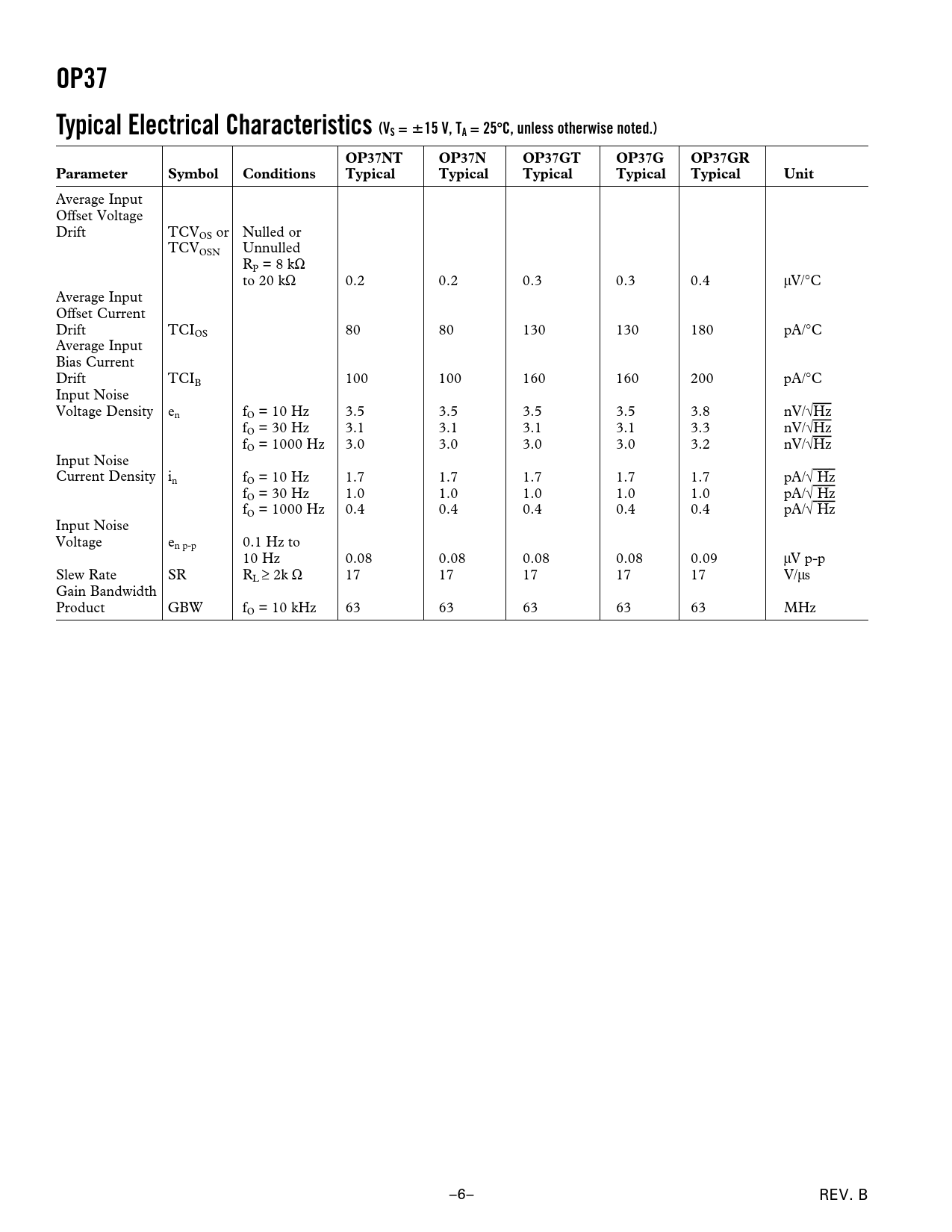 OP37 Typical Electrical Characteristics (VS = 15 V, TA = 25 C, unless otherwise noted.) OP37NT OP37N OP37GT OP37G OP37GR Parameter Symbol Conditions Typical Typical Typical Typical Typical Unit