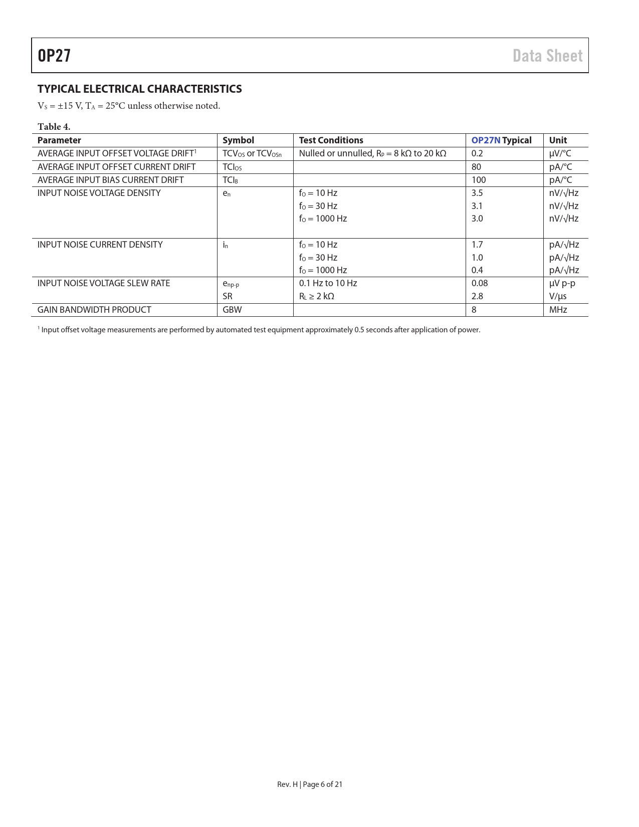 OP27 Data Sheet TYPICAL ELECTRICAL CHARACTERISTICS VS = ±15 V, TA = 25°C unless otherwise noted. Table 4. ParameterSymbolTest ConditionsOP27N TypicalUnit AVERAGE INPUT OFFSET VOLTAGE DRIFT1 TCVOS or TCVOSn Nulled or unnulled, RP = 8 kΩ to 20 kΩ 0.2 µV/°C AVERAGE INPUT OFFSET CURRENT DRIFT TCIOS 80 pA/°C AVERAGE INPUT BIAS CURRENT DRIFT TCIB 100 pA/°C INPUT NOISE VOLTAGE DENSITY en fO = 10 Hz 3.5 nV/√Hz fO = 30 Hz 3.1 nV/√Hz fO = 1000 Hz 3.0 nV/√Hz INPUT NOISE CURRENT DENSITY in fO = 10 Hz 1.7 pA/√Hz fO = 30 Hz 1.0 pA/√Hz fO = 1000 Hz 0.4 pA/√Hz INPUT NOISE VOLTAGE SLEW RATE enp-p 0.1 Hz to 10 Hz 0.08 µV p-p SR RL ≥ 2 kΩ 2.8 V/µs GAIN BANDWIDTH PRODUCT GBW 8 MHz 1 Input offset voltage measurements are performed by automated test equipment approximately 0.5 seconds after application of power. Rev. H | Page 6 of 21