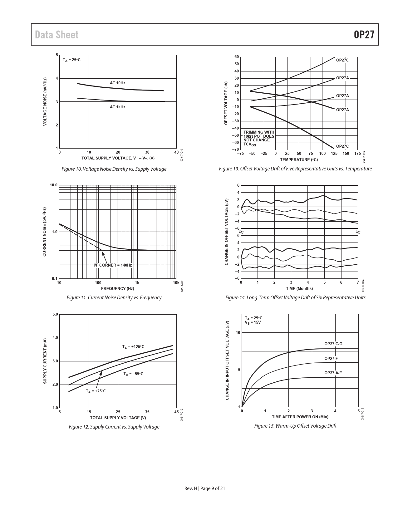 Data Sheet OP27 560TA = 25 q COP27C50404z)30OP27AAT 10Hz)/ H20V( P V(nE G10AOP27AISET0O3LNOEAT 1kHzV–10GOP27AA–20TSETLFOF–30V2O–40TRIMMING WITH–5010k : POT DOESNOT CHANGE–60TCVOS1OP27C 0 –70010203040 1 3 -0 1 7 –75–50–250255075100125150175 -0 1 7 TOTAL SUPPLY VOLTAGE, V+ – V–, (V) 3 1 0 3 0 TEMPERATURE ( q C) 0 0 Figure 10. Voltage Noise Density vs. Supply Voltage Figure 13. Offset Voltage Drift of Five Representative Units vs. Temperature 10.064)2( P V0z)E G/ HA–2AT L(pO–4VISE–6O1.0SETNF6TFENO4RINRE2UGCN A0HI/F CORNER = 140HzC–2–40.1–6 1 4 101001k10k 1 01234567 1 -0 -0 7 7 1 1 FREQUENCY (Hz) 3 3 0 TIME (Months) 0 0 0 Figure 11. Current Noise Density vs. Frequency Figure 14. Long-Term Offset Voltage Drift of Six Representative Units 5.0T)A = 25 q CVS = 15V( P V E G10)4.0A TAL OOP27 C/G(mTTA = +125 q CVENSETRFROP27 F3.0FUOCTY5TPUOP27 A/EA = –55 q CPPLINSUIN2.0E GTNA = +25 q CA H C1.01 2 5 1 515253545 1 012345 -0 -0 7 7 1 1 TOTAL SUPPLY VOLTAGE (V) 3 TIME AFTER POWER ON (Min) 3 0 0 0 0 Figure 12. Supply Current vs. Supply Voltage Figure 15. Warm-Up Offset Voltage Drift Rev. H | Page 9 of 21