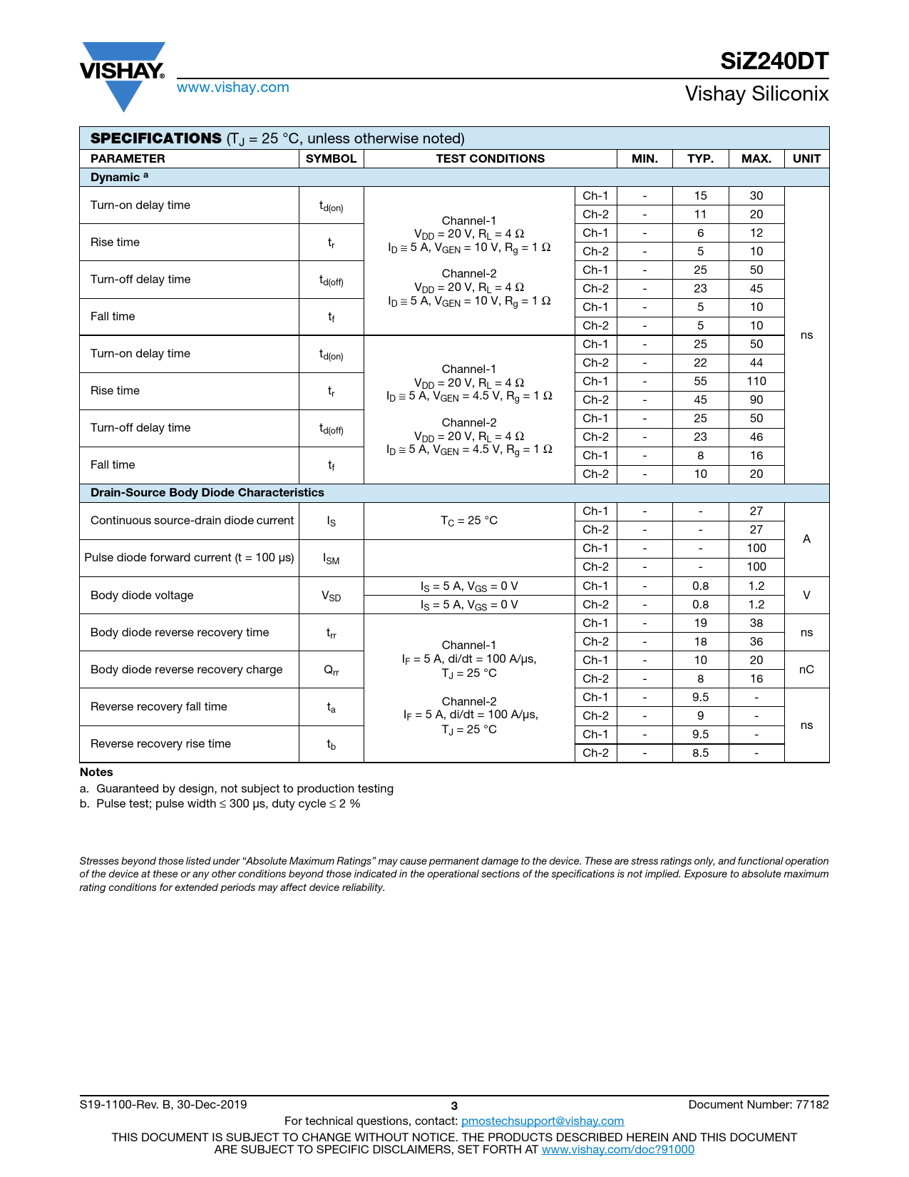 SiZ240DT www.vishay.com Vishay Siliconix SPECIFICATIONS (TJ = 25 °C, unless otherwise noted) PARAMETERSYMBOLTEST CONDITIONSMIN.TYP.MAX.UNITDynamic a Ch-1 - 15 30 Turn-on delay time td(on) Ch-2 - 11 20 Channel-1 VDD = 20 V, RL = 4 Ω Ch-1 - 6 12 Rise time tr ID ≅ 5 A, VGEN = 10 V, Rg = 1 Ω Ch-2 - 5 10 Channel-2 Ch-1 - 25 50 Turn-off delay time td(off) VDD = 20 V, RL = 4 Ω Ch-2 - 23 45 ID ≅ 5 A, VGEN = 10 V, Rg = 1 Ω Ch-1 - 5 10 Fall time tf Ch-2 - 5 10 ns Ch-1 - 25 50 Turn-on delay time td(on) Ch-2 - 22 44 Channel-1 VDD = 20 V, RL = 4 Ω Ch-1 - 55 110 Rise time tr ID ≅ 5 A, VGEN = 4.5 V, Rg = 1 Ω Ch-2 - 45 90 Channel-2 Ch-1 - 25 50 Turn-off delay time td(off) VDD = 20 V, RL = 4 Ω Ch-2 - 23 46 ID ≅ 5 A, VGEN = 4.5 V, Rg = 1 Ω Ch-1 - 8 16 Fall time tf Ch-2 - 10 20 Drain-Source Body Diode Characteristics Ch-1 - - 27 Continuous source-drain diode current IS TC = 25 °C Ch-2 - - 27 A Ch-1 - - 100 Pulse diode forward current (t = 100 μs) ISM Ch-2 - - 100 IS = 5 A, VGS = 0 V Ch-1 - 0.8 1.2 Body diode voltage VSD V IS = 5 A, VGS = 0 V Ch-2 - 0.8 1.2 Ch-1 - 19 38 Body diode reverse recovery time trr ns Channel-1 Ch-2 - 18 36 IF = 5 A, di/dt = 100 A/μs, Ch-1 - 10 20 Body diode reverse recovery charge Qrr T nC J = 25 °C Ch-2 - 8 16 Channel-2 Ch-1 - 9.5 - Reverse recovery fall time ta IF = 5 A, di/dt = 100 A/μs, Ch-2 - 9 - T ns J = 25 °C Ch-1 - 9.5 - Reverse recovery rise time tb Ch-2 - 8.5 - Notes a. Guaranteed by design, not subject to production testing b. Pulse test; pulse width ≤ 300 μs, duty cycle ≤ 2 % Stresses beyond those listed under “Absolute Maximum Ratings” may cause permanent damage to the device. These are stress ratings only, and functional operation of the device at these or any other conditions beyond those indicated in the operational sections of the specifications is not implied. Exposure to absolute maximum rating conditions for extended periods may affect device reliability. S19-1100-Rev. B, 30-Dec-2019 3 Document Number: 77182 For technical questions, contact: pmostechsupport@vishay.com THIS DOCUMENT IS SUBJECT TO CHANGE WITHOUT NOTICE. THE PRODUCTS DESCRIBED HEREIN AND THIS DOCUMENT ARE SUBJECT TO SPECIFIC DISCLAIMERS, SET FORTH AT www.vishay.com/doc?91000