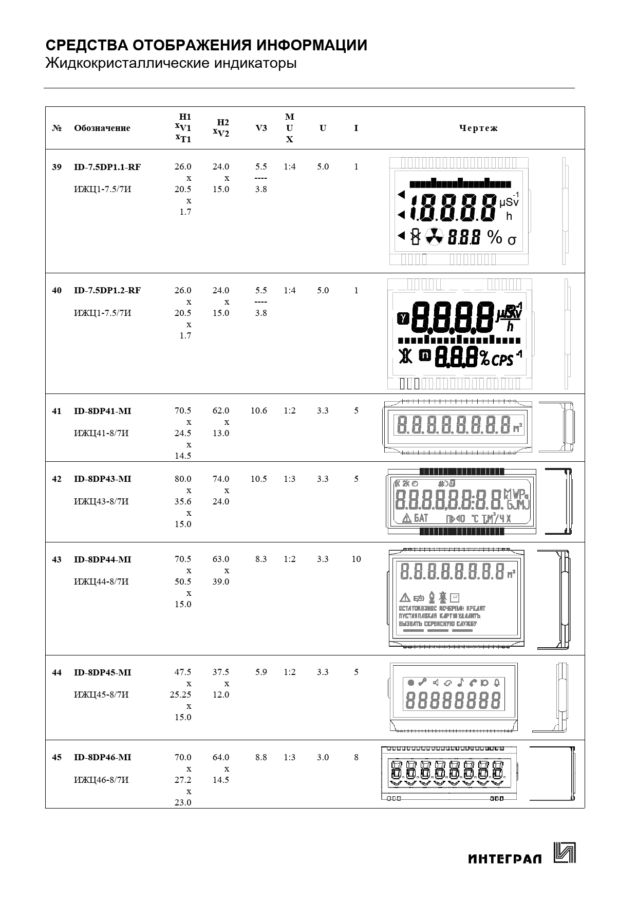 СРЕДСТВА ОТОБРАЖЕНИЯ ИНФОРМАЦИИ № Обозначение xV1 U I Ч е р т е ж 39 ID-7.5DP1.1-RF 40 ID-7.5DP1.2-RF 41 ID-8DP41-MI