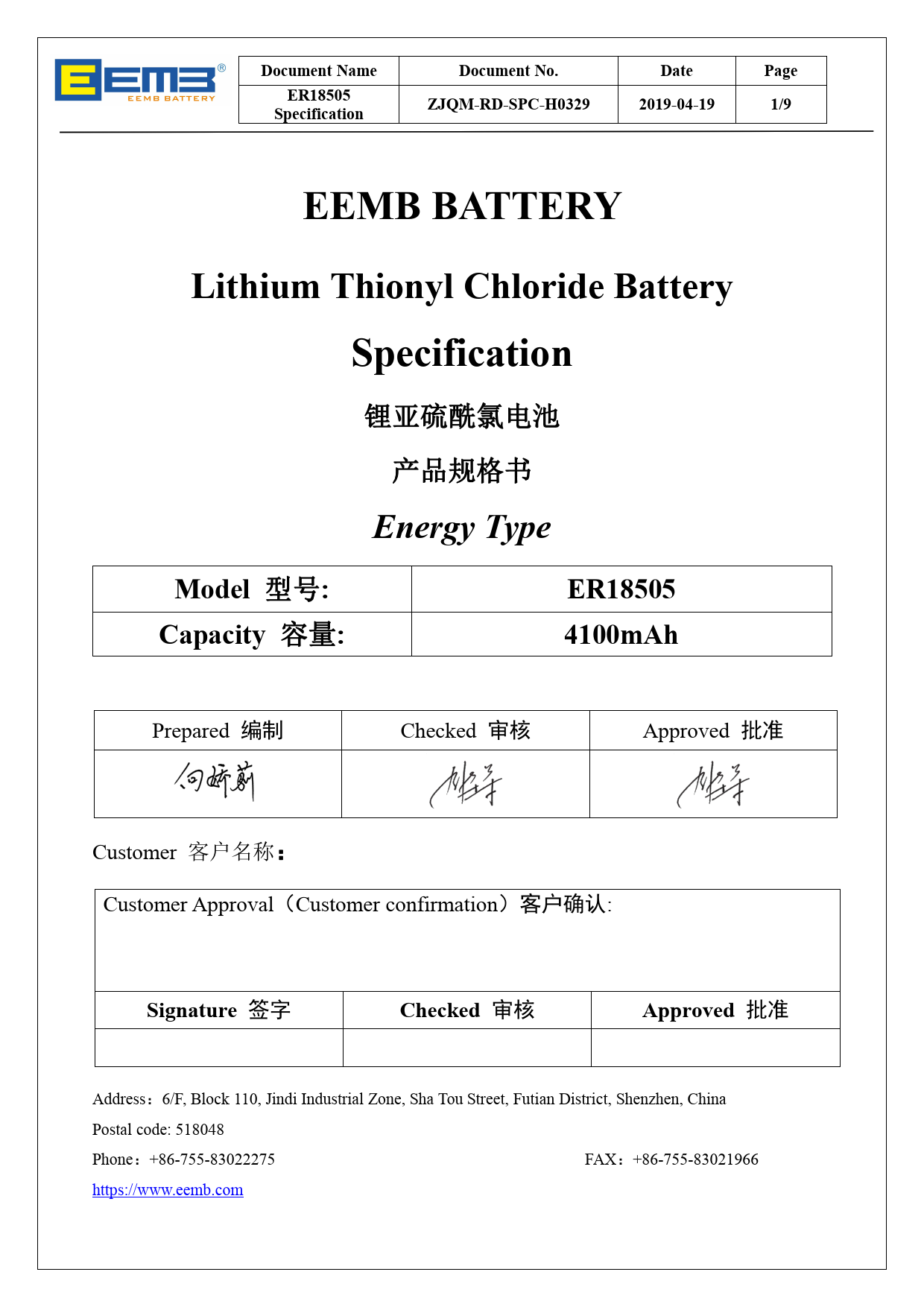 Document Name. Document No. Date. Page. ER18505. Specification. ZJQM-RD-SPC-H0329. 2019-04-19. 1/9. EEMB BATTERY