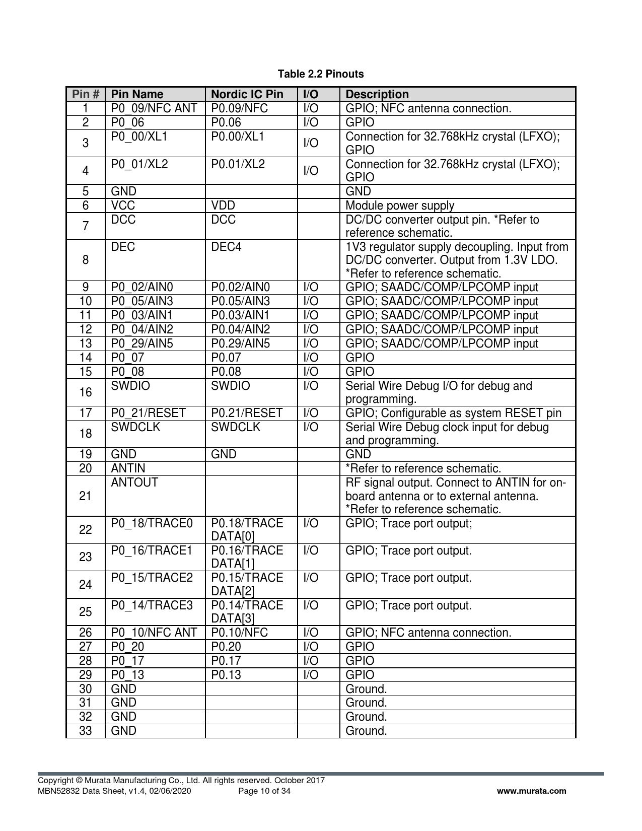 Table 2.2 Pinouts. Pin # Pin Name. Nordic IC Pin. I/O. Description. www.murata.com