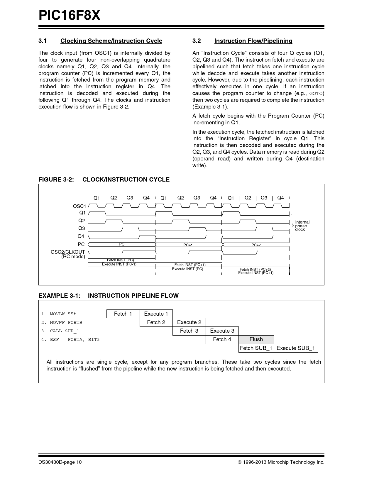 PIC16F8X3.1Clocking Scheme/Instruction Cycle3.2Instruction Flow/Pipelining The clock input (from OSC1) is internally divided by An “Instruction Cycle” consists of four Q cycles (Q1, four to generate four non-overlapping quadrature Q2, Q3 and Q4). The instruction fetch and execute are clocks namely Q1, Q2, Q3 and Q4. Internally, the pipelined such that fetch takes one instruction cycle program counter (PC) is incremented every Q1, the while decode and execute takes another instruction instruction is fetched from the program memory and cycle. However, due to the pipelining, each instruction latched into the instruction register in Q4. The effectively executes in one cycle. If an instruction instruction is decoded and executed during the causes the program counter to change (e.g., GOTO) following Q1 through Q4. The clocks and instruction then two cycles are required to complete the instruction execution flow is shown in Figure 3-2. (Example 3-1). A fetch cycle begins with the Program Counter (PC) incrementing in Q1. In the execution cycle, the fetched instruction is latched into the “Instruction Register” in cycle Q1. This instruction is then decoded and executed during the Q2, Q3, and Q4 cycles. Data memory is read during Q2 (operand read) and written during Q4 (destination write). FIGURE 3-2:CLOCK/INSTRUCTION CYCLE Q1 Q2 Q3 Q4 Q1 Q2 Q3 Q4 Q1 Q2 Q3 Q4 OSC1 Q1 Q2 Internal phase Q3 clock Q4 PC PC PC+1 PC+2 OSC2/CLKOUT (RC mode) Fetch INST (PC) Execute INST (PC-1) Fetch INST (PC+1) Execute INST (PC) Fetch INST (PC+2) Execute INST (PC+1) EXAMPLE 3-1:INSTRUCTION PIPELINE FLOW 1. MOVLW 55h Fetch 1 Execute 1 2. MOVWF PORTB Fetch 2 Execute 2 3. CALL SUB_1 Fetch 3 Execute 3 4. BSF PORTA, BIT3 Fetch 4 Flush Fetch SUB_1 Execute SUB_1 All instructions are single cycle, except for any program branches. These take two cycles since the fetch instruction is “flushed” from the pipeline while the new instruction is being fetched and then executed. DS30430D-page 10 1996-2013 Microchip Technology Inc.