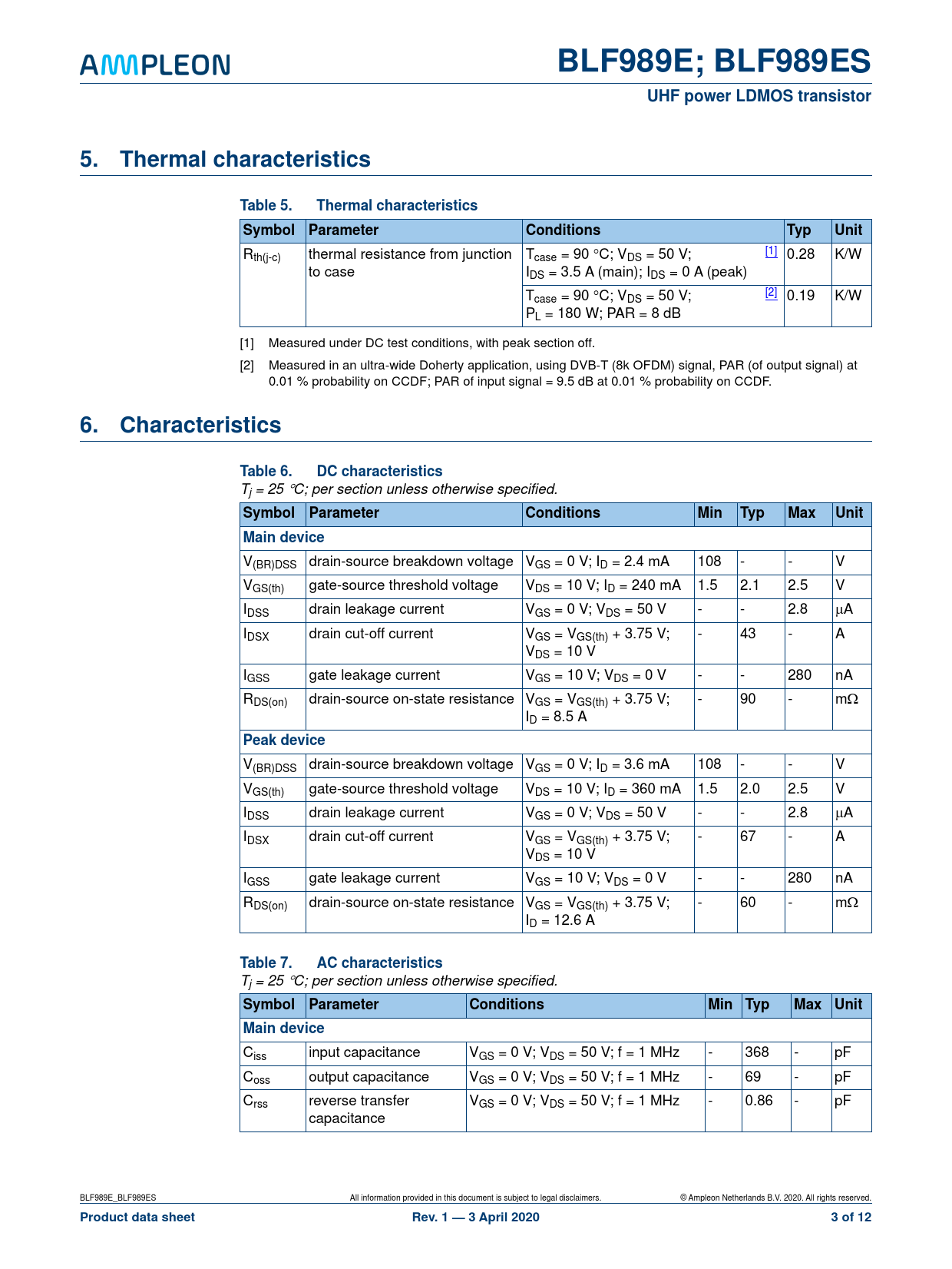 BLF989E; BLF989ES. UHF power LDMOS transistor. 5. Thermal. characteristics. Table 5. Thermal characteristics. Symbol. Parameter