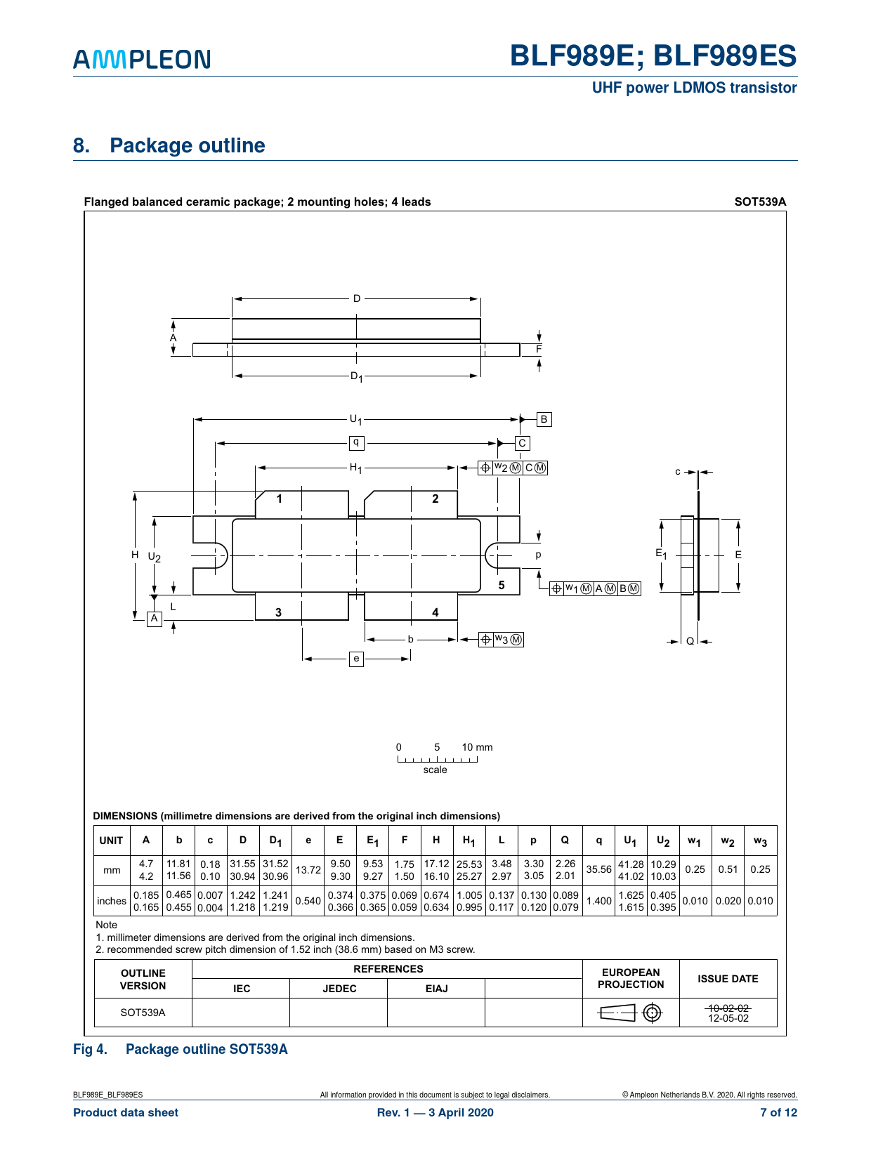 BLF989E; BLF989ES UHF power LDMOS transistor 8. Package outline Flanged balanced ceramic package; 2 mounting holes; 4 leads SOT539A
