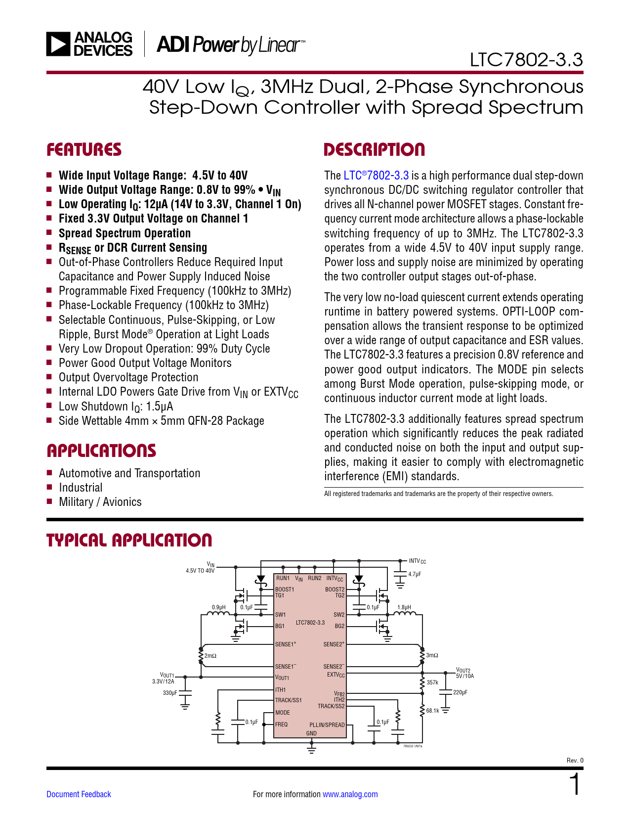 LTC7802-3.3 40V Low IQ, 3MHz Dual, 2-Phase Synchronous Step-Down Controller with Spread Spectrum
