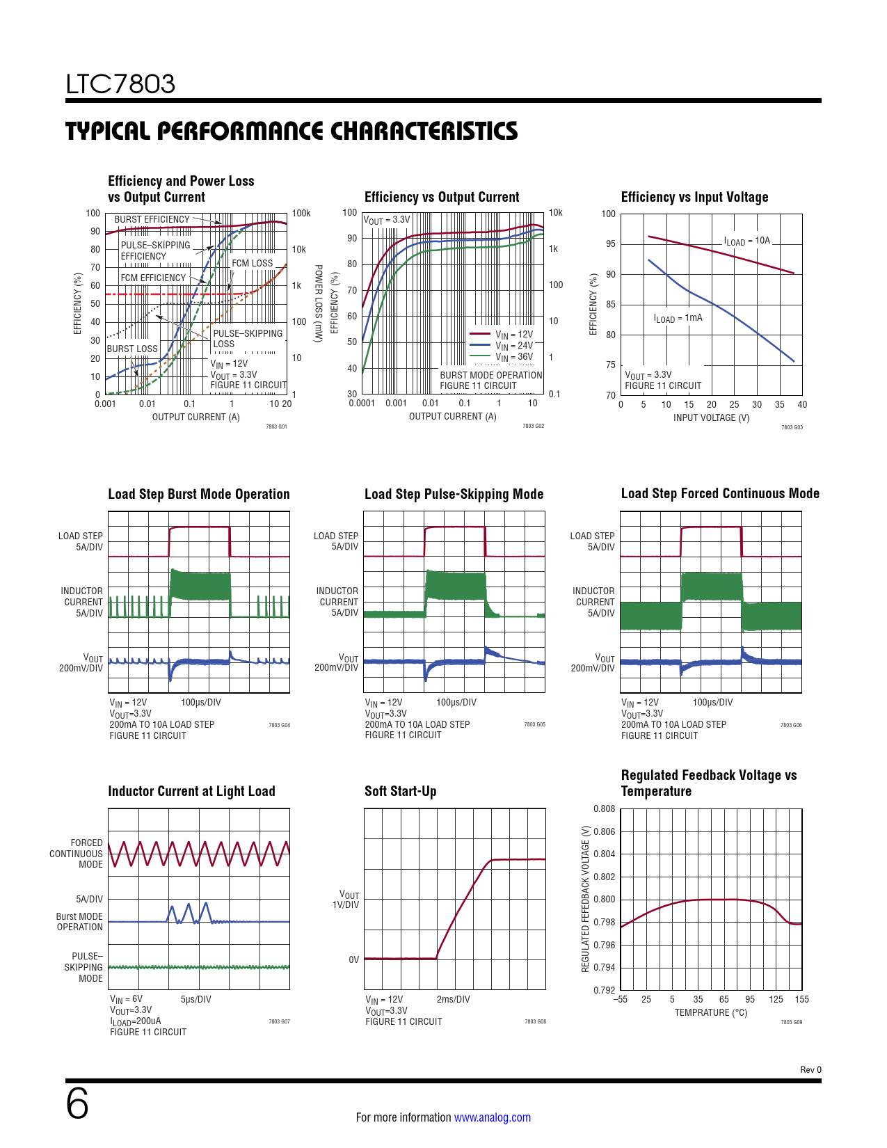 0.808 0.806 FORCED CONTINUOUS 0.804 TAGE (V) MODE 0.802 5A/DIV VOUT 1V/DIV 0.800 Burst MODE OPERATION 0.798 TED FEFEDBACK VOL 0.796 PULSE– 0V SKIPPING REGULA 0.794 MODE 0.792 VIN = 6V 5µs/DIV VIN = 12V 2ms/DIV –55 25 5 35 65 95 125 155 VOUT=3.3V VOUT=3.3V TEMPRATURE (°C) ILOAD=200uA 7803 G07 FIGURE 11 CIRCUIT 7803 G08 7803 G09 FIGURE 11 CIRCUIT Rev 0 6 For more information www.analog.com Document Outline Features Applications Typical Application Description Absolute Maximum Ratings Pin Configuration Order Information Electrical Characteristics Typical Performance Characteristics Pin Functions Functional Diagram Operation Applications Information Package Description Typical Application Related Parts