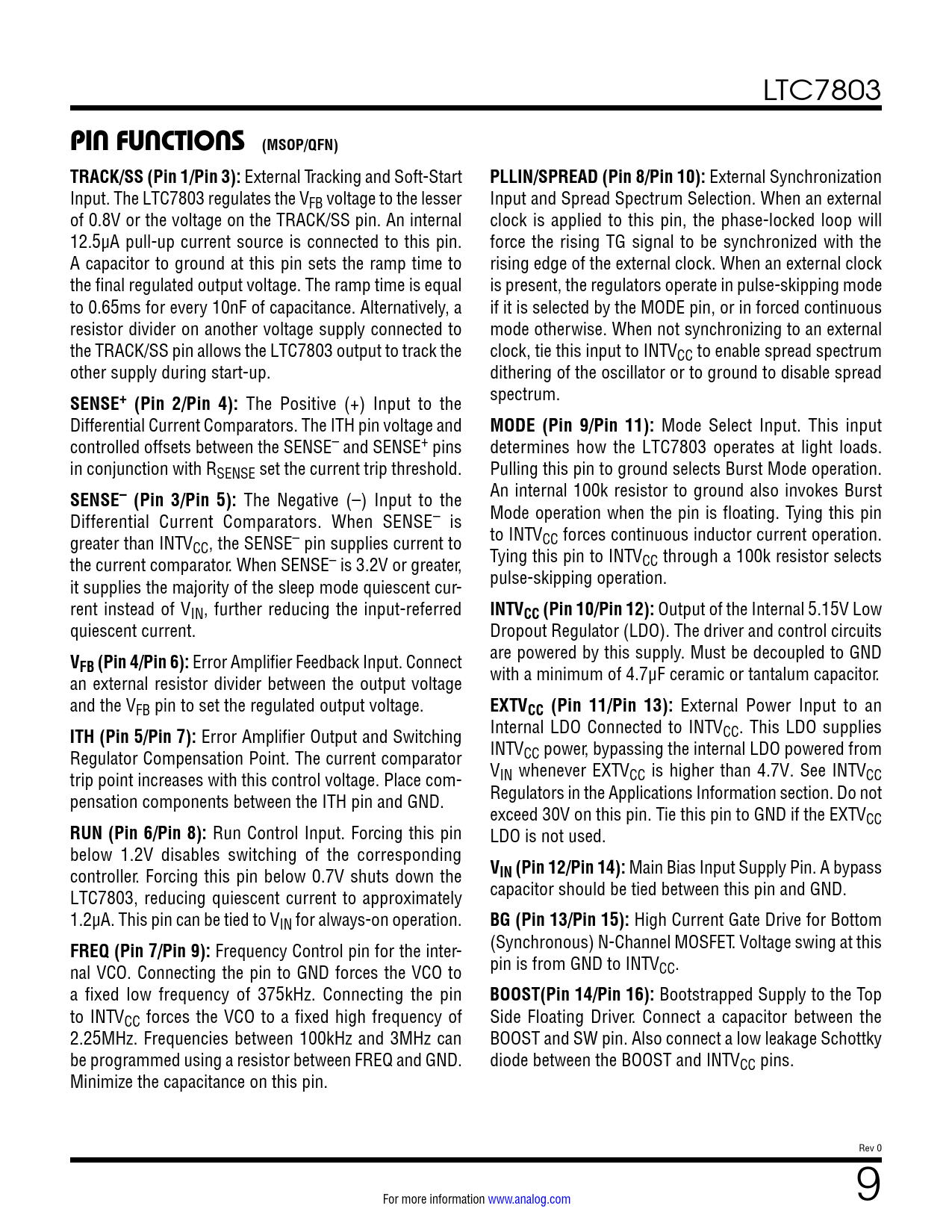 link to page 20 link to page 20 LTC7803 PIN FUNCTIONS (MSOP/QFN) TRACK/SS (Pin 1/Pin 3): External Tracking and Soft-Start PLLIN/SPREAD (Pin 8/Pin 10): External Synchronization Input. The LTC7803 regulates the VFB voltage to the lesser Input and Spread Spectrum Selection. When an external of 0.8V or the voltage on the TRACK/SS pin. An internal clock is applied to this pin, the phase-locked loop will 12.5µA pull-up current source is connected to this pin. force the rising TG signal to be synchronized with the A capacitor to ground at this pin sets the ramp time to rising edge of the external clock. When an external clock the final regulated output voltage. The ramp time is equal is present, the regulators operate in pulse-skipping mode to 0.65ms for every 10nF of capacitance. Alternatively, a if it is selected by the MODE pin, or in forced continuous resistor divider on another voltage supply connected to mode otherwise. When not synchronizing to an external the TRACK/SS pin allows the LTC7803 output to track the clock, tie this input to INTVCC to enable spread spectrum other supply during start-up. dithering of the oscillator or to ground to disable spread SENSE+ (Pin 2/Pin 4): The Positive (+) Input to the spectrum. Differential Current Comparators. The ITH pin voltage and MODE (Pin 9/Pin 11): Mode Select Input. This input controlled offsets between the SENSE– and SENSE+ pins determines how the LTC7803 operates at light loads. in conjunction with RSENSE set the current trip threshold. Pulling this pin to ground selects Burst Mode operation. SENSE– (Pin 3/Pin 5): The Negative (–) Input to the An internal 100k resistor to ground also invokes Burst Differential Current Comparators. When SENSE– is Mode operation when the pin is floating. Tying this pin greater than INTV to INTVCC forces continuous inductor current operation. CC, the SENSE– pin supplies current to the current comparator. When SENSE– is 3.2V or greater, Tying this pin to INTVCC through a 100k resistor selects it supplies the majority of the sleep mode quiescent cur- pulse-skipping operation. rent instead of VIN, further reducing the input-referred INTVCC (Pin 10/Pin 12): Output of the Internal 5.15V Low quiescent current. Dropout Regulator (LDO). The driver and control circuits V are powered by this supply. Must be decoupled to GND FB (Pin 4/Pin 6): Error Amplifier Feedback Input. Connect an external resistor divider between the output voltage with a minimum of 4.7μF ceramic or tantalum capacitor. and the VFB pin to set the regulated output voltage. EXTVCC (Pin 11/Pin 13): External Power Input to an ITH (Pin 5/Pin 7): Error Amplifier Output and Switching Internal LDO Connected to INTVCC. This LDO supplies Regulator Compensation Point. The current comparator INTVCC power, bypassing the internal LDO powered from trip point increases with this control voltage. Place com- VIN whenever EXTVCC is higher than 4.7V. See INTVCC pensation components between the ITH pin and GND. Regulators in the Applications Information section. Do not exceed 30V on this pin. Tie this pin to GND if the EXTVCC RUN (Pin 6/Pin 8): Run Control Input. Forcing this pin LDO is not used. below 1.2V disables switching of the corresponding controller. Forcing this pin below 0.7V shuts down the VIN (Pin 12/Pin 14): Main Bias Input Supply Pin. A bypass LTC7803, reducing quiescent current to approximately capacitor should be tied between this pin and GND. 1.2µA. This pin can be tied to VIN for always-on operation. BG (Pin 13/Pin 15): High Current Gate Drive for Bottom FREQ (Pin 7/Pin 9): Frequency Control pin for the inter- (Synchronous) N-Channel MOSFET. Voltage swing at this nal VCO. Connecting the pin to GND forces the VCO to pin is from GND to INTVCC. a fixed low frequency of 375kHz. Connecting the pin BOOST(Pin 14/Pin 16): Bootstrapped Supply to the Top to INTVCC forces the VCO to a fixed high frequency of Side Floating Driver. Connect a capacitor between the 2.25MHz. Frequencies between 100kHz and 3MHz can BOOST and SW pin. Also connect a low leakage Schottky be programmed using a resistor between FREQ and GND. diode between the BOOST and INTVCC pins. Minimize the capacitance on this pin. Rev 0 For more information www.analog.com 9 Document Outline Features Applications Typical Application Description Absolute Maximum Ratings Pin Configuration Order Information Electrical Characteristics Typical Performance Characteristics Pin Functions Functional Diagram Operation Applications Information Package Description Typical Application Related Parts