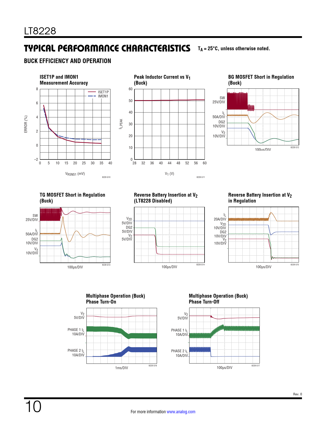 V2 V2 5V/DIV 5V/DIV PHASE 1 IL PHASE 1 IL 10A/DIV 10A/DIV PHASE 2 IL PHASE 2 IL 10A/DIV 10A/DIV 1ms/DIV 8228 G16 100µs/DIV 8228 G17 Rev. 0 10 For more information www.analog.com Document Outline Features Applications Typical Application Description Absolute Maximum Ratings Order Information Pin Configuration Electrical Characteristics Typical Performance Characteristics Buck Efficiency and Operation Typical Performance Characteristics Boost Efficiency and Operation ENABLE, Supply Current and VCC SS Current, Frequency, Thresholds and Driver Protection MOSFET Controller Pin Functions Block Diagram Operation Overview Buck Mode Operation Boost Mode Operation V1 Protection MOSFET Controller Operation V2 Protection MOSFET Controller Operation Mode of Operation (DRXN) Enable and Soft-Start (Enable and SS) Paralleling Multiple Controllers (ISHARE AND IGND) BIAS Supply and VCC Regulators Strong Gate Drivers Frequency Selection, Spread Spectrum and Phase-Locked Loop (RT and SYNC) FAULT Monitoring and REPORT Feature Applications Information Introduction Programming the Switching Frequency Inductor Selection RSNS2 and RIN2 Selection for Peak Inductor Current RSET2P Selection for V2 Output Current Limit (Buck Mode) RSET2N Selection for V2 Input Current Limit (Boost Mode) RMON2 Selection for V2 Current Monitoring RSNS1 and RIN1 Selection RSET1P Selection for V1 Input Current Limit (Buck Mode) RSET1N Selection for V1 Output Current Limit (Boost Mode) RMON1 Selection for V1 Current Monitoring Output Voltage, Input Undervoltage and Output Overvoltage Programming Power MOSFET Selection and Efficiency Considerations Optional Schottky Diode (D2 and D3) Selection Top MOSFET Driver Supply (CBST, DBST) Power Path Capacitor Selection Loop Compensation Inrush Current Control Boost Output Short Protection and Timer FAULT Conditions Soft-Start REPORT Feature Paralleling Multiple LT8228s BIAS, DRVCC, INTVCC and Power Dissipation Thermal Shutdown Pin Clearance/Creepage Consideration Efficiency Considerations PC Board Layout Checklist Design Example Package Description Typical Application Related Parts Features Applications Typical Application Description Absolute Maximum Ratings Order Information Pin Configuration Electrical Characteristics Typical Performance Characteristics Pin Functions Block Diagram Operation Applications Information Package Description Typical Application Related Parts