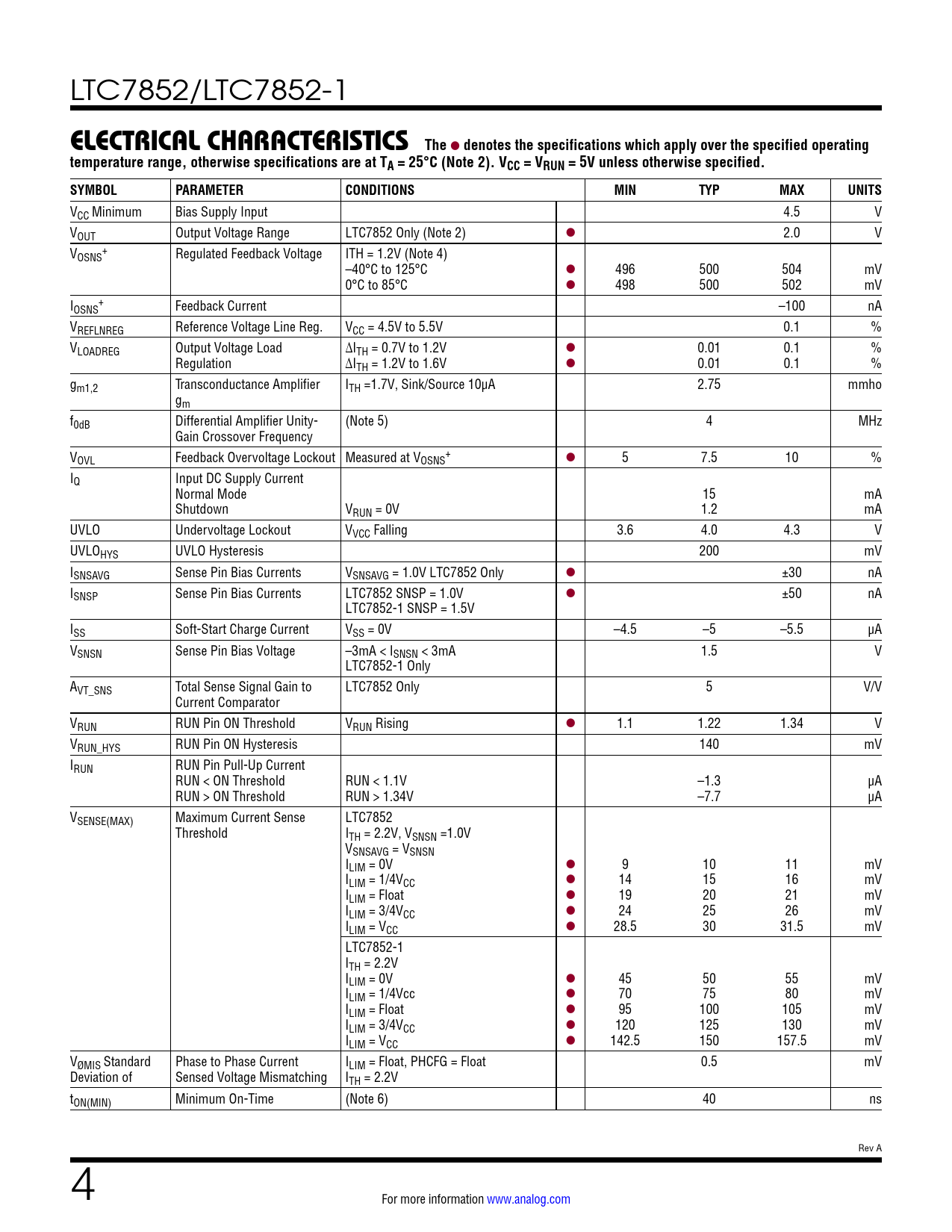 LTC7852/LTC7852-1 ELECTRICAL CHARACTERISTICSThe l denotes the specifications which apply over the specified operatingtemperature range, otherwise specifications are at TA = 25°C (Note 2). VCC = VRUN = 5V unless otherwise specified. SYMBOLPARAMETERCONDITIONSMINTYPMAXUNITS VCC Minimum Bias Supply Input 4.5 V VOUT Output Voltage Range LTC7852 Only (Note 2) l 2.0 V V + OSNS Regulated Feedback Voltage ITH = 1.2V (Note 4) –40°C to 125°C l 496 500 504 mV 0°C to 85°C l 498 500 502 mV I + OSNS Feedback Current –100 nA VREFLNREG Reference Voltage Line Reg. VCC = 4.5V to 5.5V 0.1 % VLOADREG Output Voltage Load ΔITH = 0.7V to 1.2V l 0.01 0.1 % Regulation ΔITH = 1.2V to 1.6V l 0.01 0.1 % gm1,2 Transconductance Amplifier ITH =1.7V, Sink/Source 10µA 2.75 mmho gm f0dB Differential Amplifier Unity- (Note 5) 4 MHz Gain Crossover Frequency V + OVL Feedback Overvoltage Lockout Measured at VOSNS l 5 7.5 10 % IQ Input DC Supply Current Normal Mode 15 mA Shutdown VRUN = 0V 1.2 mA UVLO Undervoltage Lockout VVCC Falling 3.6 4.0 4.3 V UVLOHYS UVLO Hysteresis 200 mV ISNSAVG Sense Pin Bias Currents VSNSAVG = 1.0V LTC7852 Only l ±30 nA ISNSP Sense Pin Bias Currents LTC7852 SNSP = 1.0V l ±50 nA LTC7852-1 SNSP = 1.5V ISS Soft-Start Charge Current VSS = 0V –4.5 –5 –5.5 µA VSNSN Sense Pin Bias Voltage –3mA < ISNSN < 3mA 1.5 V LTC7852-1 Only AVT_SNS Total Sense Signal Gain to LTC7852 Only 5 V/V Current Comparator VRUN RUN Pin ON Threshold VRUN Rising l 1.1 1.22 1.34 V VRUN_HYS RUN Pin ON Hysteresis 140 mV IRUN RUN Pin Pull-Up Current RUN < ON Threshold RUN < 1.1V –1.3 µA RUN > ON Threshold RUN > 1.34V –7.7 µA VSENSE(MAX) Maximum Current Sense LTC7852 Threshold ITH = 2.2V, VSNSN =1.0V VSNSAVG = VSNSN ILIM = 0V l 9 10 11 mV ILIM = 1/4VCC l 14 15 16 mV ILIM = Float l 19 20 21 mV ILIM = 3/4VCC l 24 25 26 mV ILIM = VCC l 28.5 30 31.5 mV LTC7852-1 ITH = 2.2V ILIM = 0V l 45 50 55 mV ILIM = 1/4Vcc l 70 75 80 mV ILIM = Float l 95 100 105 mV ILIM = 3/4VCC l 120 125 130 mV ILIM = VCC l 142.5 150 157.5 mV VØMIS Standard Phase to Phase Current ILIM = Float, PHCFG = Float 0.5 mV Deviation of Sensed Voltage Mismatching ITH = 2.2V tON(MIN) Minimum On-Time (Note 6) 40 ns Rev A 4 For more information www.analog.com Document Outline Features Applications Typical Application Description Absolute Maximum Ratings Order Information Electrical Characteristics Typical Performance Characteristics Pin Functions Functional Block Diagrams Operation Applications Information Typical Applications Package Description Revision History Typical Application Related Parts