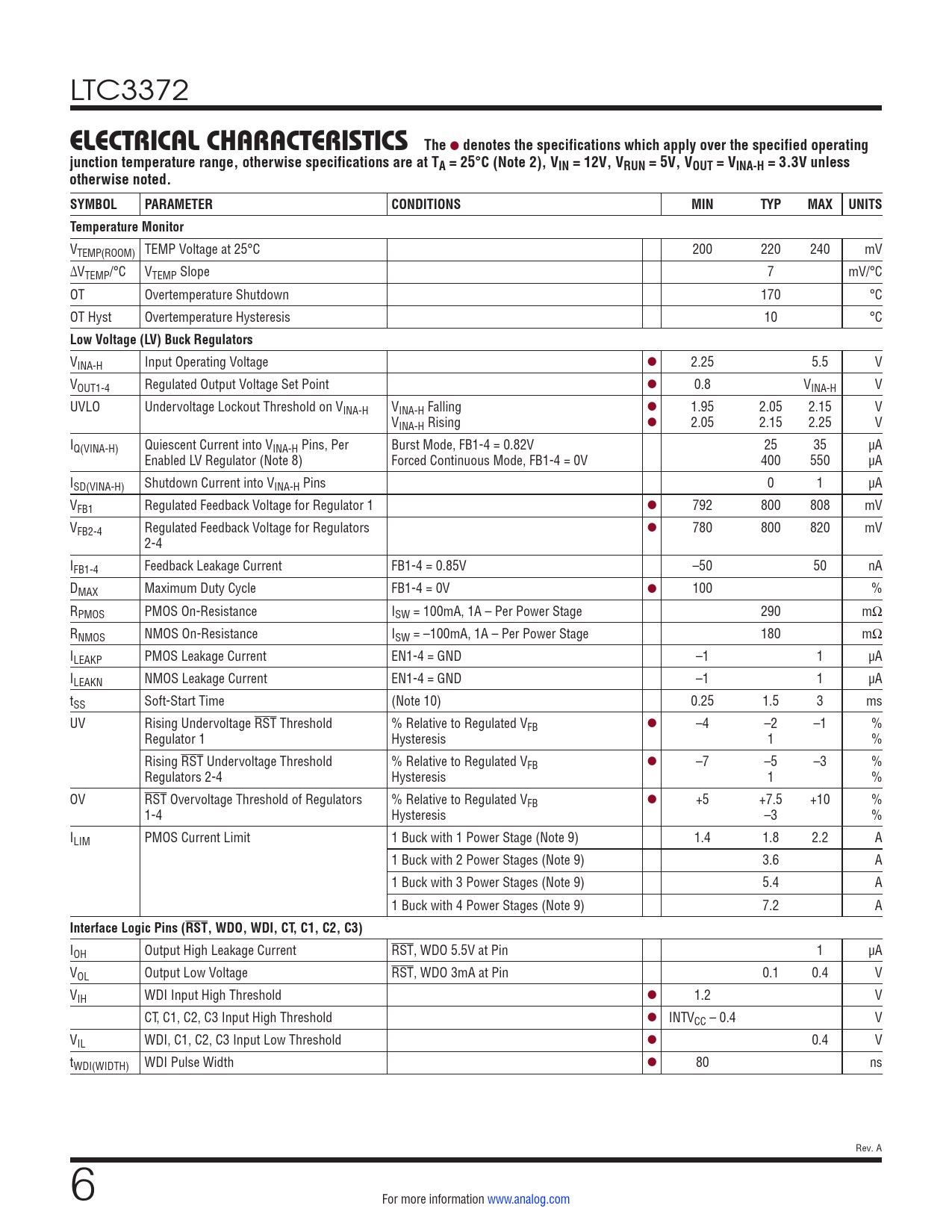 LTC3372 ELECTRICAL CHARACTERISTICSThe l denotes the specifications which apply over the specified operatingjunction temperature range, otherwise specifications are at TA = 25°C (Note 2), VIN = 12V, VRUN = 5V, VOUT = VINA-H = 3.3V unlessotherwise noted.SYMBOLPARAMETERCONDITIONSMINTYPMAX UNITSTemperature Monitor VTEMP(ROOM) TEMP Voltage at 25°C 200 220 240 mV ∆VTEMP/°C VTEMP Slope 7 mV/°C OT Overtemperature Shutdown 170 °C OT Hyst Overtemperature Hysteresis 10 °C Low Voltage (LV) Buck Regulators VINA-H Input Operating Voltage l 2.25 5.5 V VOUT1-4 Regulated Output Voltage Set Point l 0.8 VINA-H V UVLO Undervoltage Lockout Threshold on VINA-H VINA-H Falling l 1.95 2.05 2.15 V VINA-H Rising l 2.05 2.15 2.25 V IQ(VINA-H) Quiescent Current into VINA-H Pins, Per Burst Mode, FB1-4 = 0.82V 25 35 µA Enabled LV Regulator (Note 8) Forced Continuous Mode, FB1-4 = 0V 400 550 µA ISD(VINA-H) Shutdown Current into VINA-H Pins 0 1 µA VFB1 Regulated Feedback Voltage for Regulator 1 l 792 800 808 mV VFB2-4 Regulated Feedback Voltage for Regulators l 780 800 820 mV 2-4 IFB1-4 Feedback Leakage Current FB1-4 = 0.85V –50 50 nA DMAX Maximum Duty Cycle FB1-4 = 0V l 100 % RPMOS PMOS On-Resistance ISW = 100mA, 1A – Per Power Stage 290 mΩ RNMOS NMOS On-Resistance ISW = –100mA, 1A – Per Power Stage 180 mΩ ILEAKP PMOS Leakage Current EN1-4 = GND –1 1 µA ILEAKN NMOS Leakage Current EN1-4 = GND –1 1 µA tSS Soft-Start Time (Note 10) 0.25 1.5 3 ms UV Rising Undervoltage RST Threshold % Relative to Regulated VFB l –4 –2 –1 % Regulator 1 Hysteresis 1 % Rising RST Undervoltage Threshold % Relative to Regulated VFB l –7 –5 –3 % Regulators 2-4 Hysteresis 1 % OV RST Overvoltage Threshold of Regulators % Relative to Regulated VFB l +5 +7.5 +10 % 1-4 Hysteresis –3 % ILIM PMOS Current Limit 1 Buck with 1 Power Stage (Note 9) 1.4 1.8 2.2 A 1 Buck with 2 Power Stages (Note 9) 3.6 A 1 Buck with 3 Power Stages (Note 9) 5.4 A 1 Buck with 4 Power Stages (Note 9) 7.2 A Interface Logic Pins (RST, WDO, WDI, CT, C1, C2, C3) IOH Output High Leakage Current RST, WDO 5.5V at Pin 1 µA VOL Output Low Voltage RST, WDO 3mA at Pin 0.1 0.4 V VIH WDI Input High Threshold l 1.2 V CT, C1, C2, C3 Input High Threshold l INTVCC – 0.4 V VIL WDI, C1, C2, C3 Input Low Threshold l 0.4 V tWDI(WIDTH) WDI Pulse Width l 80 ns Rev. A 6 For more information www.analog.com Document Outline Features Applications Typical Application Description Absolute Maximum Ratings Order Information Electrical Characteristics Typical Performance Characteristics Pin Functions Block Diagram Operation Low Voltage Regulators Applications Information High Voltage Buck Controller Low Voltage Buck Regulators Printed Circuit Board PCB Layout Considerations Typical Applications Package Description Revision History Typical Application Related Parts