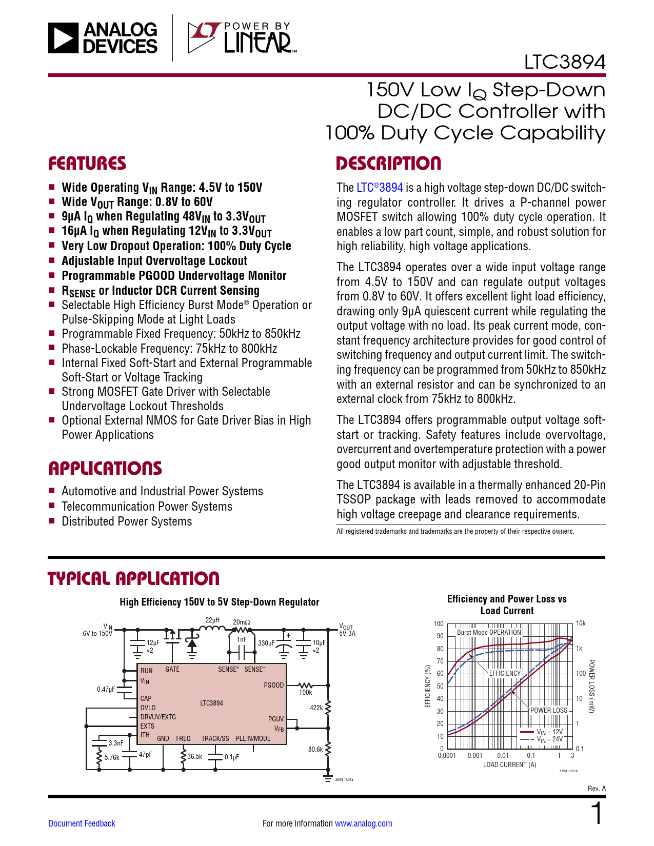 The LTC3894 is available in a thermally enhanced 20-Pin n Automotive and Industrial Power Systems TSSOP package with leads removed to accommodate n Telecommunication Power Systems high voltage creepage and clearance requirements. n Distributed Power Systems All registered trademarks and trademarks are the property of their respective owners.