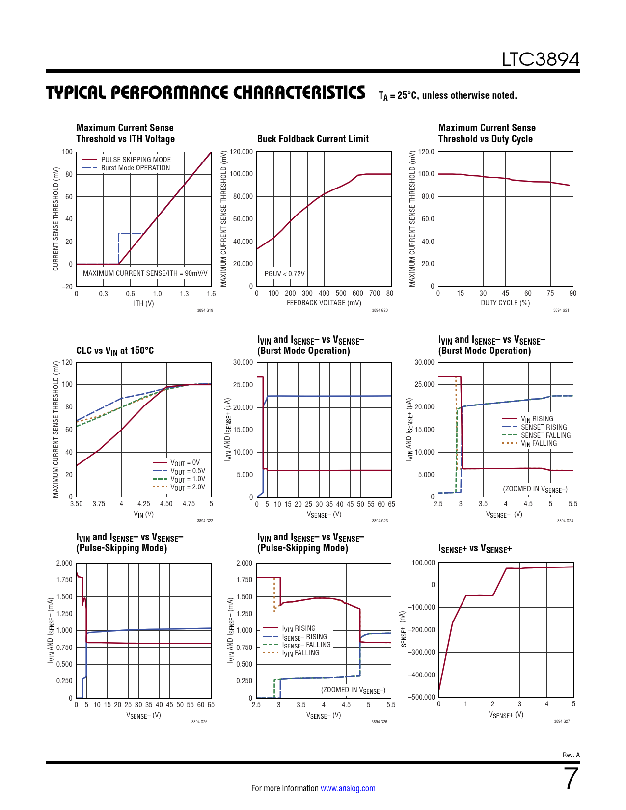 100 120.000 120.0 PULSE SKIPPING MODE Burst Mode OPERATION 80 100.000 100.0 60 80.000 80.0 40 60.000 60.0 20 40.000 40.0 0 20.000 20.0 CURRENT SENSE THRESHOLD (mV) MAXIMUM CURRENT SENSE/ITH = 90mV/V PGUV < 0.72V –20 MAXIMUM CURRENT SENSE THRESHOLD (mV) 0 MAXIMUM CURRENT SENSE THRESHOLD (mV) 0 0 0.3 0.6 1.0 1.3 1.6 0 100 200 300 400 500 600 700 800 0 15 30 45 60 75 90 ITH (V) FEEDBACK VOLTAGE (mV) DUTY CYCLE (%) 3894 G19 3894 G20 3894 G21