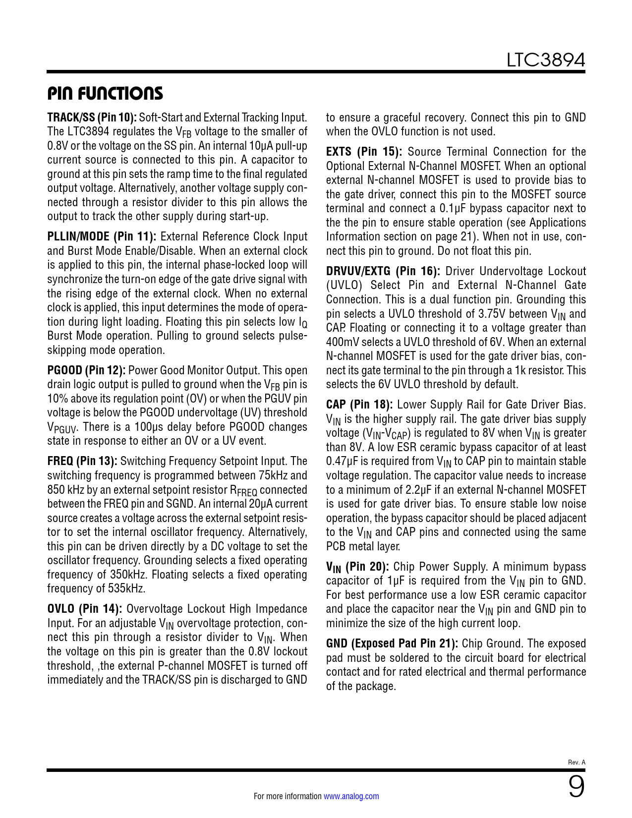 PIN FUNCTIONS TRACK/SS (Pin 10):. EXTS (Pin 15):. PLLIN/MODE (Pin 11):. DRVUV/EXTG (Pin 16):. PGOOD (Pin 12):. CAP (Pin 18):