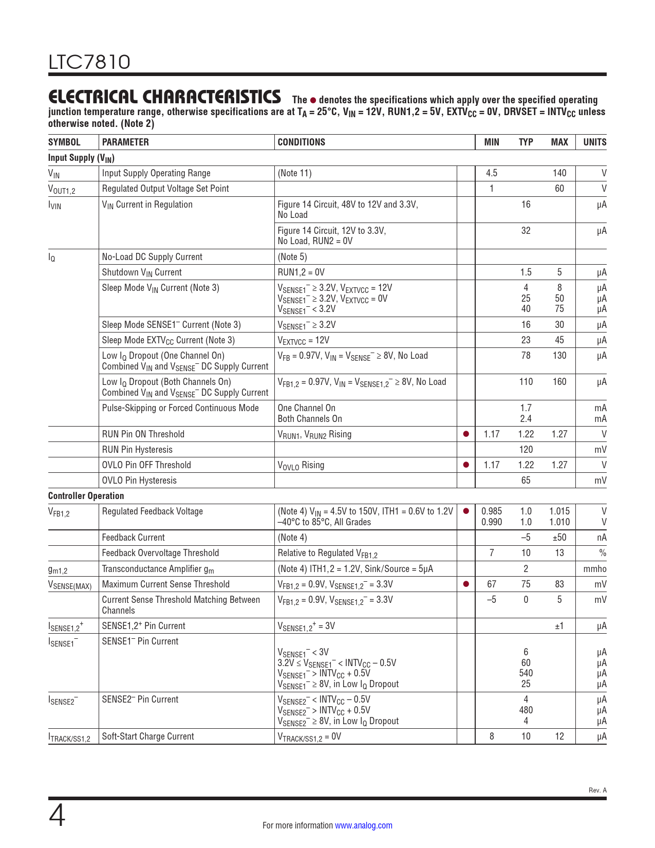 link to page 36 link to page 36 LTC7810 ELECTRICAL CHARACTERISTICSThe l denotes the specifications which apply over the specified operatingjunction temperature range, otherwise specifications are at TA = 25°C, VIN = 12V, RUN1,2 = 5V, EXTVCC = 0V, DRVSET = INTVCC unlessotherwise noted. (Note 2) SYMBOLPARAMETERCONDITIONSMINTYPMAXUNITSInput Supply (VIN) VIN Input Supply Operating Range (Note 11) 4.5 140 V VOUT1,2 Regulated Output Voltage Set Point 1 60 V IVIN VIN Current in Regulation Figure 14 Circuit, 48V to 12V and 3.3V, 16 μA No Load Figure 14 Circuit, 12V to 3.3V, 32 μA No Load, RUN2 = 0V IQ No-Load DC Supply Current (Note 5) Shutdown VIN Current RUN1,2 = 0V 1.5 5 μA Sleep Mode V – IN Current (Note 3) VSENSE1 ≥ 3.2V, VEXTVCC = 12V 4 8 µA V – SENSE1 ≥ 3.2V, VEXTVCC = 0V 25 50 µA V – SENSE1 < 3.2V 40 75 µA Sleep Mode SENSE1– Current (Note 3) V – SENSE1 ≥ 3.2V 16 30 μA Sleep Mode EXTVCC Current (Note 3) VEXTVCC = 12V 23 45 μA Low I – Q Dropout (One Channel On) VFB = 0.97V, VIN = VSENSE ≥ 8V, No Load 78 130 μA Combined V – IN and VSENSE DC Supply Current Low I – Q Dropout (Both Channels On) VFB1,2 = 0.97V, VIN = VSENSE1,2 ≥ 8V, No Load 110 160 μA Combined V – IN and VSENSE DC Supply Current Pulse-Skipping or Forced Continuous Mode One Channel On 1.7 mA Both Channels On 2.4 mA RUN Pin ON Threshold VRUN1, VRUN2 Rising l 1.17 1.22 1.27 V RUN Pin Hysteresis 120 mV OVLO Pin OFF Threshold VOVLO Rising l 1.17 1.22 1.27 V OVLO Pin Hysteresis 65 mV Controller Operation VFB1,2 Regulated Feedback Voltage (Note 4) VIN = 4.5V to 150V, ITH1 = 0.6V to 1.2V l 0.985 1.0 1.015 V –40°C to 85°C, All Grades 0.990 1.0 1.010 V Feedback Current (Note 4) –5 ±50 nA Feedback Overvoltage Threshold Relative to Regulated VFB1,2 7 10 13 % gm1,2 Transconductance Amplifier gm (Note 4) ITH1,2 = 1.2V, Sink/Source = 5μA 2 mmho V – SENSE(MAX) Maximum Current Sense Threshold VFB1,2 = 0.9V, VSENSE1,2 = 3.3V l 67 75 83 mV Current Sense Threshold Matching Between V – FB1,2 = 0.9V, VSENSE1,2 = 3.3V –5 0 5 mV Channels I + + SENSE1,2 SENSE1,2+ Pin Current VSENSE1,2 = 3V ±1 μA I – SENSE1 SENSE1– Pin Current V – SENSE1 < 3V 6 μA 3.2V ≤ V – SENSE1 < INTVCC – 0.5V 60 μA V – SENSE1 > INTVCC + 0.5V 540 μA V – SENSE1 ≥ 8V, in Low IQ Dropout 25 μA I – – SENSE2 SENSE2– Pin Current VSENSE2 < INTVCC – 0.5V 4 μA V – SENSE2 > INTVCC + 0.5V 480 μA V – SENSE2 ≥ 8V, in Low IQ Dropout 4 μA ITRACK/SS1,2 Soft-Start Charge Current VTRACK/SS1,2 = 0V 8 10 12 µA Rev. A 4 For more information www.analog.com Document Outline Features Applications Typical Application Description Absolute Maximum Ratings Order Information Pin Configuration Electrical Characteristics Typical Performance Characteristics Pin Functions Functional Diagram Operation Main Control Loop Power and Bias Supplies (VIN, NDRV, EXTVCC, DRVCC, REGSD) Boost Supply and Dropout (BOOST and SW pins) Start-Up and Shutdown (RUN, TRACK/SS, OVLO Pins) Light Load Operation: Burst Mode Operation, Pulse Skipping or Forced Continuous Mode (MODE Pin) Frequency Selection, Spread Spectrum, and Phase-Locked Loop (FREQ and PLLIN/SPREAD Pins) Applications Information Current Sense Selection Low Value Resistor Current Sensing Inductor DCR Sensing Setting the Operating Frequency Selecting the Light-Load Operating Mode Inductor Value Calculation Inductor Core Selection Power MOSFET Selection CIN and COUT Selection Setting the Output Voltage RUN Pins and Overvoltage/Undervoltage Lockout Tracking and Soft-Start (TRACK/SS1, TRACK/SS2 Pins) Single Output Two-Phase Operation DRVCC Regulators Topside MOSFET Driver Supply (CB, DB) Burst Clamp Programming Fault Conditions: Current Limit and Current Foldback Fault Conditions: Overvoltage Protection (Crowbar) Fault Conditions: Overtemperature Protection Phase-Locked Loop and Frequency Synchronization Minimum On-Time Considerations Efficiency Considerations Checking Transient Response Design Example PC Board Layout Checklist PC Board Layout Debugging Typical Applications Package Description Revision History Typical Application Related Parts
