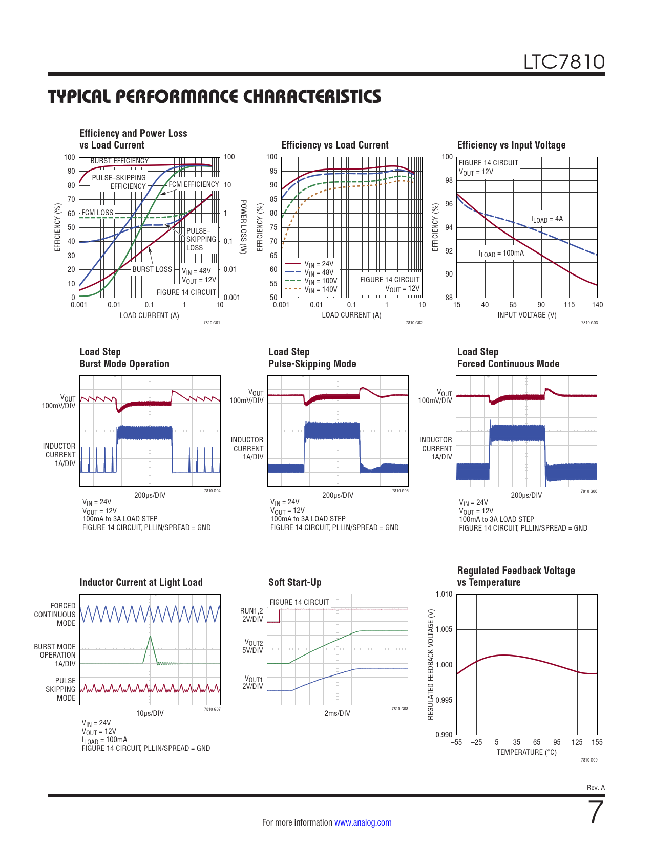 100 BURST EFFICIENCY 100 100 100 FIGURE 14 CIRCUIT 90 95 V PULSE–SKIPPING OUT = 12V 98 80 EFFICIENCY FCM EFFICIENCY 10 90 70 POWER LOSS (W) 85 96 60 FCM LOSS 1 80 ILOAD = 4A 50 PULSE– 75 94 SKIPPING 40 0.1 70 EFFICIENCY (%) LOSS EFFICIENCY (%) EFFICIENCY (%) 92 30 65 ILOAD = 100mA V 20 BURST LOSS IN = 24V VIN = 48V 0.01 60 VIN = 48V 90 VOUT = 12V 10 V FIGURE 14 CIRCUIT 55 IN = 100V FIGURE 14 CIRCUIT V V IN = 140V OUT = 12V 0 0.001 50 88 0.001 0.01 0.1 1 10 0.001 0.01 0.1 1 10 15 40 65 90 115 140 LOAD CURRENT (A) LOAD CURRENT (A) INPUT VOLTAGE (V) 7810 G01 7810 G02 7810 G03