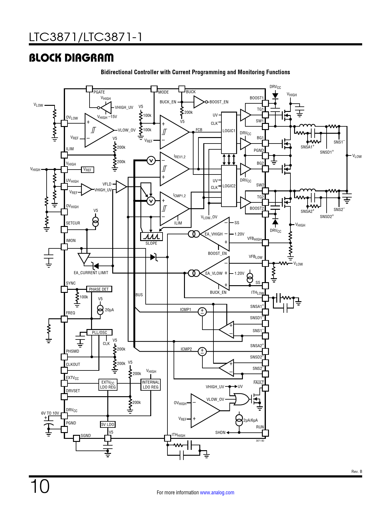 DRVCC PGATE MODE BUCK VHIGH VHIGH BOOST1 V BUCK_EN BOOST_EN LOW VHIGH_UV V5 TG1 200k OV 100k UV LOW V + HIGH –15V + V5 CLK SW1 VLOW_OV 100k FCB LOGIC1 DRVCC VREF – V5 V BG1 REF – SNS1– ILIM 200k SNSA1+ PGND SNSD1+ – IREV1,2 VLOW V 200k HIGH BG2 VHIGH VREF + UVHIGH UV DRVCC VFLD LOGIC2 SW2 VHIGH_UV CLK VREF ICMP1,2 + TG2 OVHIGH BOOST2 V5 SNSA2+ SNS2– – VLOW_OV – SNSD2+ SETCUR ILIM SS VHIGH – DRVCC EA_VHIGH 1.20V IMON + VFBHIGH SLOPE BOOST_EN – VFBLOW VLOW + EA_CURRENT LIMIT EA_VLOW 1.20V SYNC + SS PHASE DET BUCK_EN ITHLOW 100k BUS V5 SNSA1+ 20µA ICMP1 + FREQ – SNSD1+ + PLL/OSC – SNS1– V5 CLK SNSA2+ PHSMD 200k ICMP2 +– SNSD2+ CLKOUT V5 200k + V SNS2– HIGH 200k – EXTVCC EXTVCC INTERNAL FAULT LDO REG LDO REG VHIGH_UV UV DRVSET – VLOW_OV 200k OVHIGH DRVCC 6V TO 10V + + VREF 2µA/6µA PGND 5V LDO RUN V5 SGND ITH SHDN HIGH 3871 BD Rev. B 10 For more information www.analog.com Document Outline Features Applications Typical Application Description Absolute Maximum Ratings Order Information Pin Configuration Electrical Characteristics Typical Performance Characteristics Pin Functions Block Diagram Operation Applications Information Package Description Revision History Typical Application Related Parts
