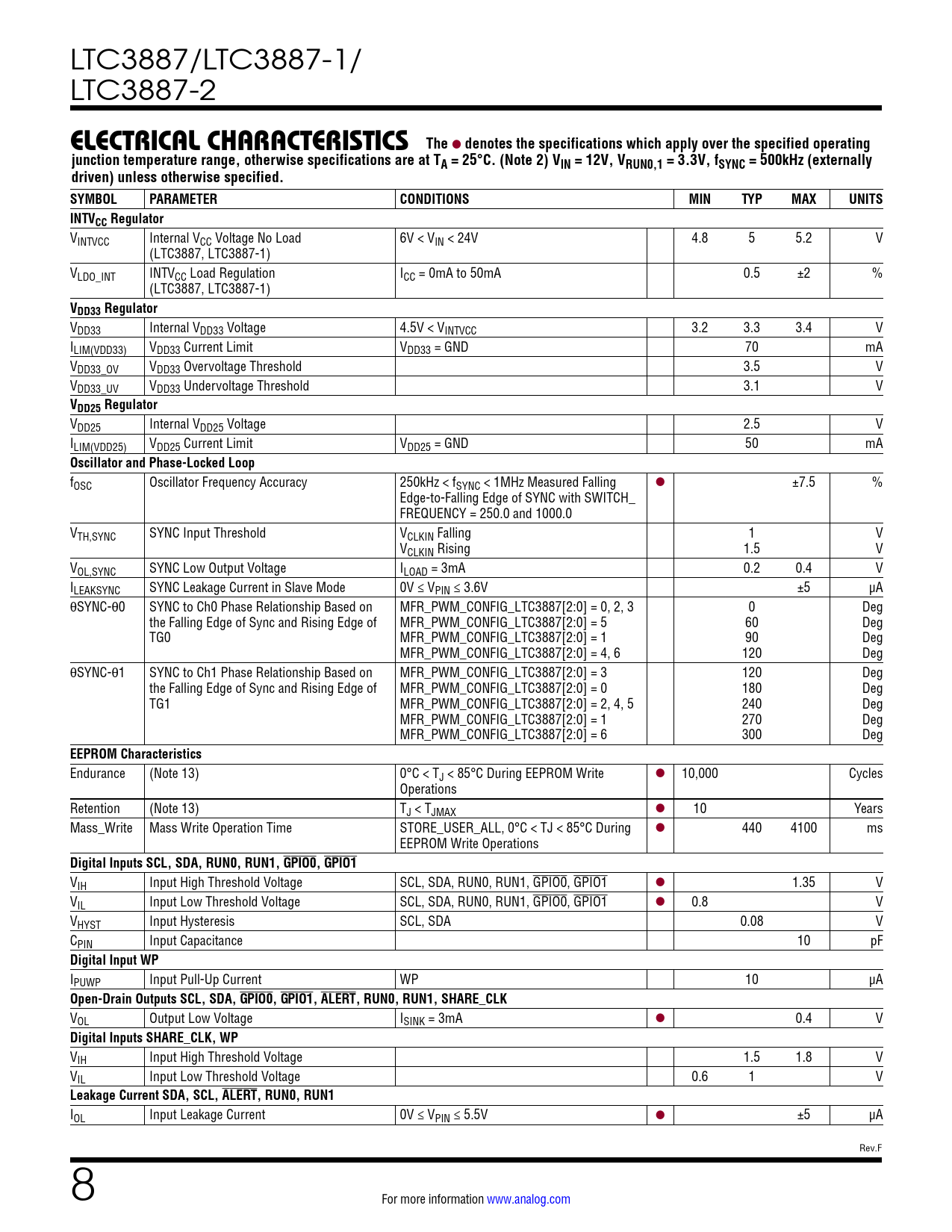 LTC3887/LTC3887-1/ LTC3887-2 ELECTRICAL CHARACTERISTICSThe l denotes the specifications which apply over the specified operatingjunction temperature range, otherwise specifications are at TA = 25°C. (Note 2) VIN = 12V, VRUN0,1 = 3.3V, fSYNC = 500kHz (externallydriven) unless otherwise specified.SYMBOLPARAMETERCONDITIONSMINTYPMAXUNITSINTVCC Regulator VINTVCC Internal VCC Voltage No Load 6V < VIN < 24V 4.8 5 5.2 V (LTC3887, LTC3887-1) VLDO_INT INTVCC Load Regulation ICC = 0mA to 50mA 0.5 ±2 % (LTC3887, LTC3887-1) VDD33 Regulator VDD33 Internal VDD33 Voltage 4.5V < VINTVCC 3.2 3.3 3.4 V ILIM(VDD33) VDD33 Current Limit VDD33 = GND 70 mA VDD33_OV VDD33 Overvoltage Threshold 3.5 V VDD33_UV VDD33 Undervoltage Threshold 3.1 V VDD25 Regulator VDD25 Internal VDD25 Voltage 2.5 V ILIM(VDD25) VDD25 Current Limit VDD25 = GND 50 mA Oscillator and Phase-Locked Loop fOSC Oscillator Frequency Accuracy 250kHz < fSYNC < 1MHz Measured Falling l ±7.5 % Edge-to-Falling Edge of SYNC with SWITCH_ FREQUENCY = 250.0 and 1000.0 VTH,SYNC SYNC Input Threshold VCLKIN Falling 1 V VCLKIN Rising 1.5 V VOL,SYNC SYNC Low Output Voltage ILOAD = 3mA 0.2 0.4 V ILEAKSYNC SYNC Leakage Current in Slave Mode 0V ≤ VPIN ≤ 3.6V ±5 µA θSYNC-θ0 SYNC to Ch0 Phase Relationship Based on MFR_PWM_CONFIG_LTC3887[2:0] = 0, 2, 3 0 Deg the Falling Edge of Sync and Rising Edge of MFR_PWM_CONFIG_LTC3887[2:0] = 5 60 Deg TG0 MFR_PWM_CONFIG_LTC3887[2:0] = 1 90 Deg MFR_PWM_CONFIG_LTC3887[2:0] = 4, 6 120 Deg θSYNC-θ1 SYNC to Ch1 Phase Relationship Based on MFR_PWM_CONFIG_LTC3887[2:0] = 3 120 Deg the Falling Edge of Sync and Rising Edge of MFR_PWM_CONFIG_LTC3887[2:0] = 0 180 Deg TG1 MFR_PWM_CONFIG_LTC3887[2:0] = 2, 4, 5 240 Deg MFR_PWM_CONFIG_LTC3887[2:0] = 1 270 Deg MFR_PWM_CONFIG_LTC3887[2:0] = 6 300 Deg EEPROM Characteristics Endurance (Note 13) 0°C < TJ < 85°C During EEPROM Write l 10,000 Cycles Operations Retention (Note 13) TJ < TJMAX l 10 Years Mass_Write Mass Write Operation Time STORE_USER_ALL, 0°C < TJ < 85°C During l 440 4100 ms EEPROM Write Operations Digital Inputs SCL, SDA, RUN0, RUN1, GPIO0, GPIO1 VIH Input High Threshold Voltage SCL, SDA, RUN0, RUN1, GPIO0, GPIO1 l 1.35 V VIL Input Low Threshold Voltage SCL, SDA, RUN0, RUN1, GPIO0, GPIO1 l 0.8 V VHYST Input Hysteresis SCL, SDA 0.08 V CPIN Input Capacitance 10 pF Digital Input WP IPUWP Input Pull-Up Current WP 10 µA Open-Drain Outputs SCL, SDA, GPIO0, GPIO1, ALERT, RUN0, RUN1, SHARE_CLK VOL Output Low Voltage ISINK = 3mA l 0.4 V Digital Inputs SHARE_CLK, WP VIH Input High Threshold Voltage 1.5 1.8 V VIL Input Low Threshold Voltage 0.6 1 V Leakage Current SDA, SCL, ALERT, RUN0, RUN1 IOL Input Leakage Current 0V ≤ VPIN ≤ 5.5V l ±5 µA Rev.F 8 For more information www.analog.com Document Outline Features Applications Typical Application Description Table of Contents Absolute Maximum Ratings Pin Configuration Order Information Electrical Characteristics Typical Performance Characteristics Pin Functions Block Diagram Operation Overview Main Control Loop EEPROM (NVM) Power Up and Initialization Soft-Start Sequencing EVENT-Based Sequencing Shutdown Light Load Current Operation Switching Frequency and Phase Output Voltage Sensing Current Sensing PolyPhase Load Sharing External/Internal Temperature Sense RCONFIG (Resistor Configuration) Pins Fault Detection and Handling Internal EEPROM with CRC Protection and ECC Serial Interface Communication Protection Device Addressing Responses to VOUT and IOUT Faults Output Overvoltage Fault Response Output Undervoltage Response Peak Output Overcurrent Fault Response Responses to Timing Faults Responses to VIN OV Faults Responses to OT/UT Faults Internal Overtemperature Fault/Warn Response External Overtemperature and Undertemperature Fault Response Responses to External Faults Fault Logging Bus Timeout Protection Similarity Between PMBus, SMBus and I2C 2-Wire Interface PMBus Serial Digital Interface PMBus Command Summary PMBus Commands *Data Format Applications Information Current Limit Programming ISENSE+ and ISENSE– Pins Low Value Resistor Current Sensing Inductor DCR Current Sensing Slope Compensation and Inductor Peak Current Inductor Value Calculation Inductor Core Selection Power MOSFET and Schottky Diode (Optional) Selection Variable Delay Time, Soft-Start and Output Voltage Ramping Digital Servo Mode Soft Off (Sequenced Off) INTVCC Regulator Topside MOSFET Driver Supply (CB, DB) (LTC3887, LTC3887-2) Undervoltage Lockout CIN and COUT Selection Fault Conditions Open-Drain Pins Phase-Locked Loop and Frequency Synchronization Minimum On-Time Considerations RCONFIG (External Resistor Configuration Pins) Voltage Selection Frequency and Phase Selection Using RCONFIG Address Selection Using RCONFIG Efficiency Considerations Checking Transient Response PC Board Layout Checklist PC Board Layout Debugging Design Example Additional Design Checks Connecting the USB to the I2C/SMBus/PMBus Controller to the LTC3887 In System LTpowerPlay: An Interactive GUI for Digital Power PMBus Communication and Command Processing PMBus Command Details Addressing and Write Protect General Configuration Registers On/Off/Margin PWM Config Voltage Input Voltage and Limits Output Voltage and Limits Current Input Current Calibration Output Current Calibration Input Current Output Current Temperature External Temperature Calibration External Temperature Limits Timing Timing—On Sequence/Ramp Timing—Off Sequence/Ramp Precondition for Restart Fault Response Fault Responses All Faults Fault Responses Input Voltage Fault Responses Output Voltage Fault Responses Output Current Fault Responses IC Temperature Fault Responses External Temperature Fault Sharing Fault Sharing Propagation Fault Sharing Response Scratchpad Identification Fault Warning and Status Telemetry NVM (EEPROM) Memory Commands Store/Restore Fault Logging Block Memory Write/Read Typical Applications Package Description Revision History Typical Application Related Parts